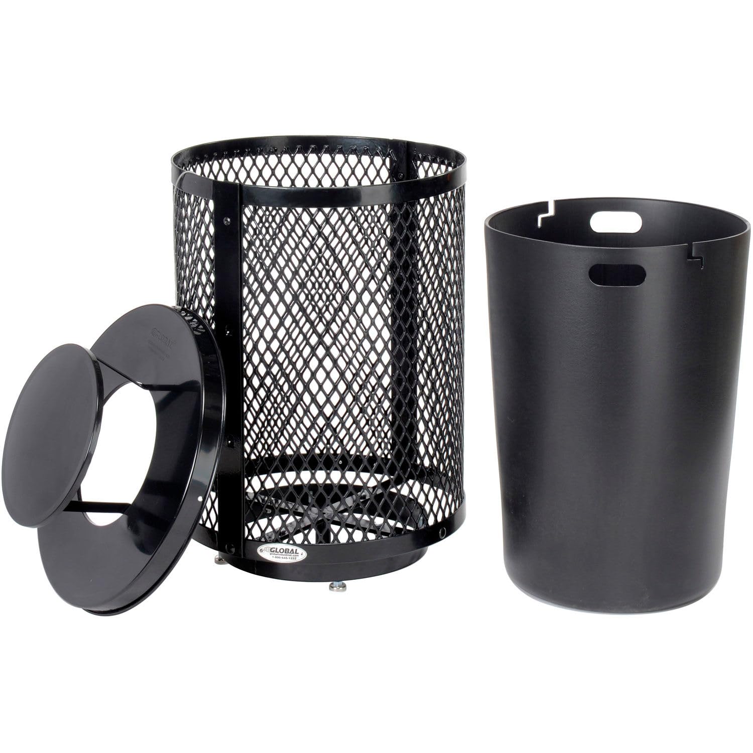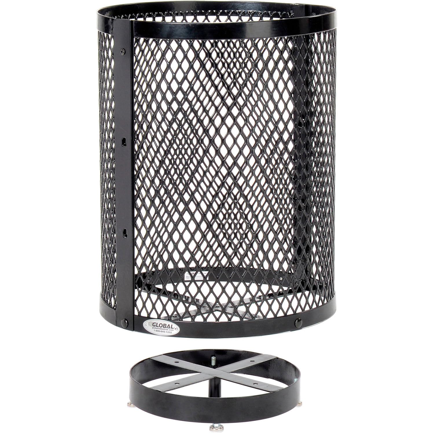 Global Industrial Outdoor Diamond Steel Trash Can with Rain Bonnet Lid, Raised Base and Plastic Liner, 36 Gallon Capacity, Black, Thermoplastic Coating, 23-1/2" Diameter, 43-1/2"H
