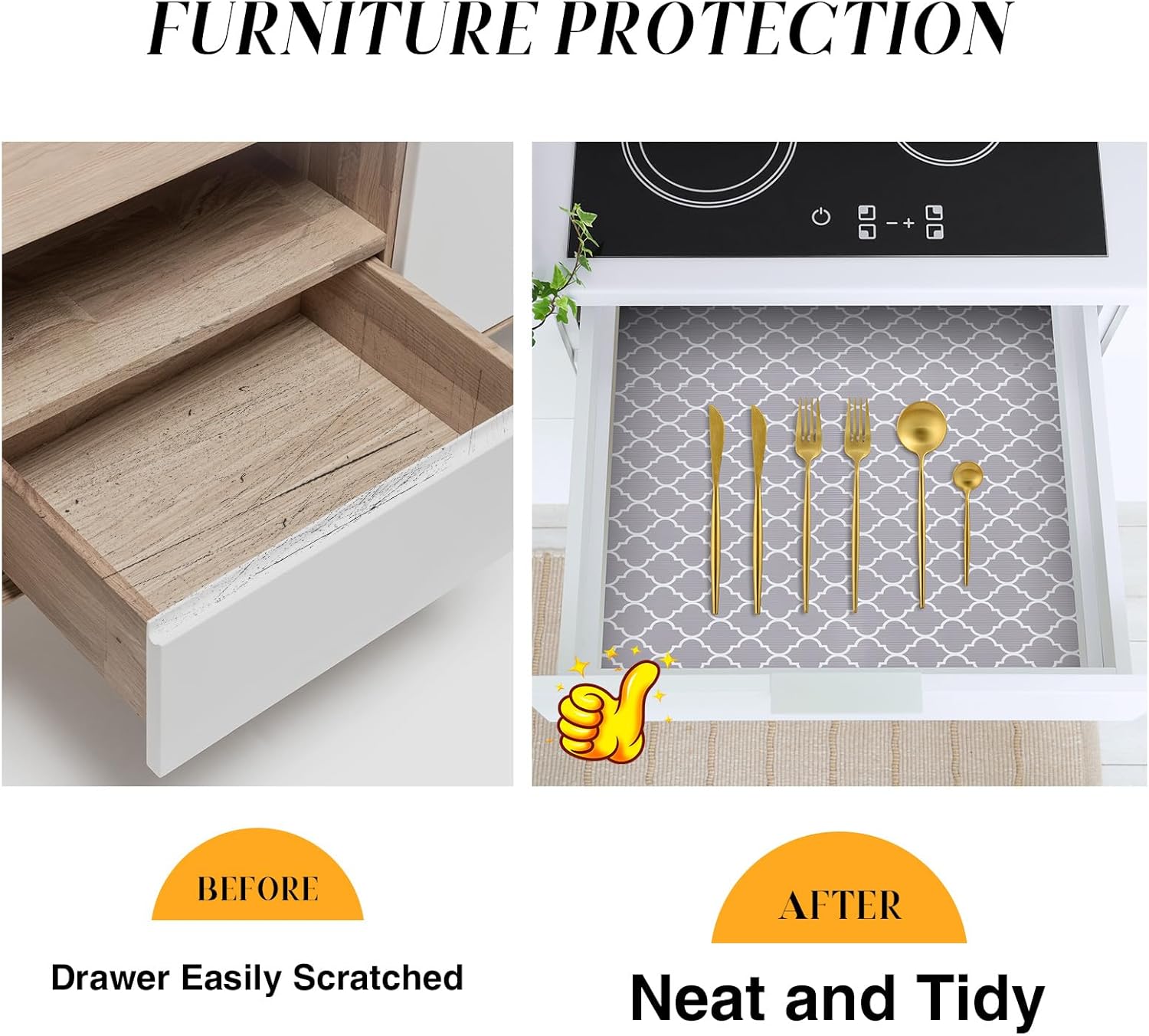 • Non Adhesive Shelf Liners with Easy Installation- This drawer liners for kitchen is in the most popular pre-cut sizes for easy installation. For unique sizes and shapes, you can simply trim the kitchen cabinet liner with household scissors. Just place the liners down in your drawer or cabinet and trim off any excess material. Plus, the drawer liners are non-adhesive and easily removable.