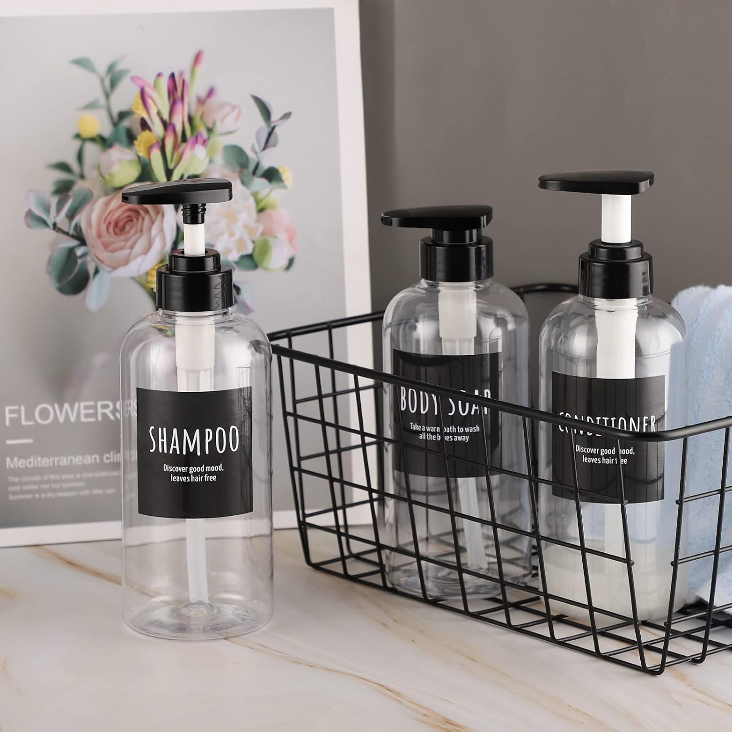 • 【Simple Look】 Its elegant look upgrade your bathroom. Each dispenser bottle holds 16.9oz large capacity to meet the whole family's essential needs. Set of 3 packs of pre-labeled with water-proof label bottles, indicating shampoo, body soap and conditioner, can help you identify them easily. It could clean up the shower look and help organize your bathroom essentials.