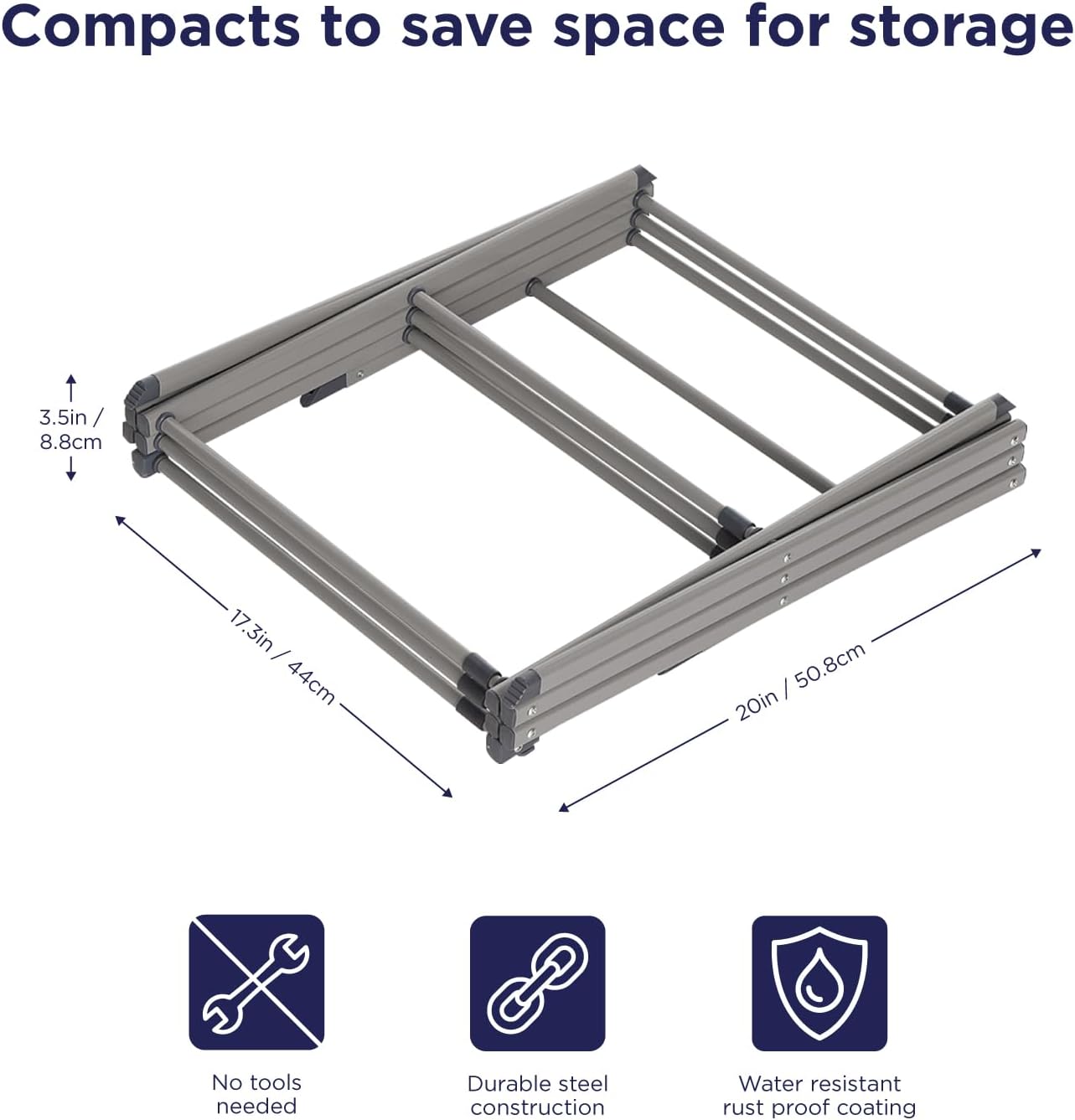 • SPACE-SAVING: Portable drying rack, you can easily fold it flat for compact storage in a closet or next to the washing machine, ready and waiting for next time Collapsed Size: 17" x 21" x 3", Partail Expanded Size: 17" x 41" x 21" Fully Expanded: 30" x 41" x 17"