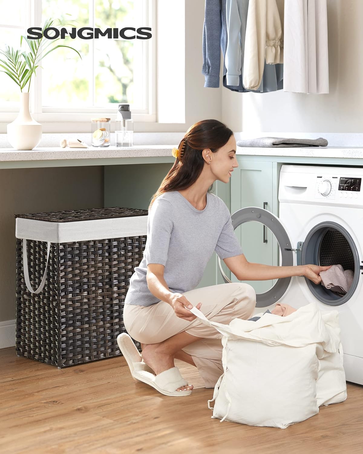 SONGMICS Laundry Hamper with Lid, 110L Clothes Hamper with 2 Removable Liner Bags, 6 Mesh Bags, Wicker Laundry Basket, Double Laundry Hamper for Bathroom, 13 x 22.4 x 23.6 Inches, Brown ULCB052K02