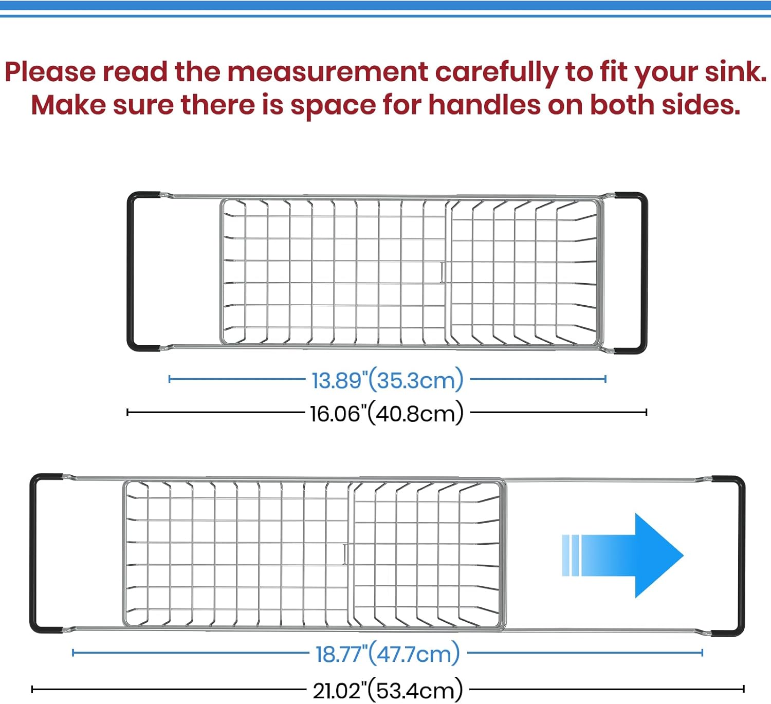 • TELESCOPIC SINK STORAGE RACK - The kitchen sink organizer expands from 16.06" to 21.02" wide, increasing available storage space and is more flexible than other sink organizers. Perfect for sinks from 16 to 21 inches in length or width.