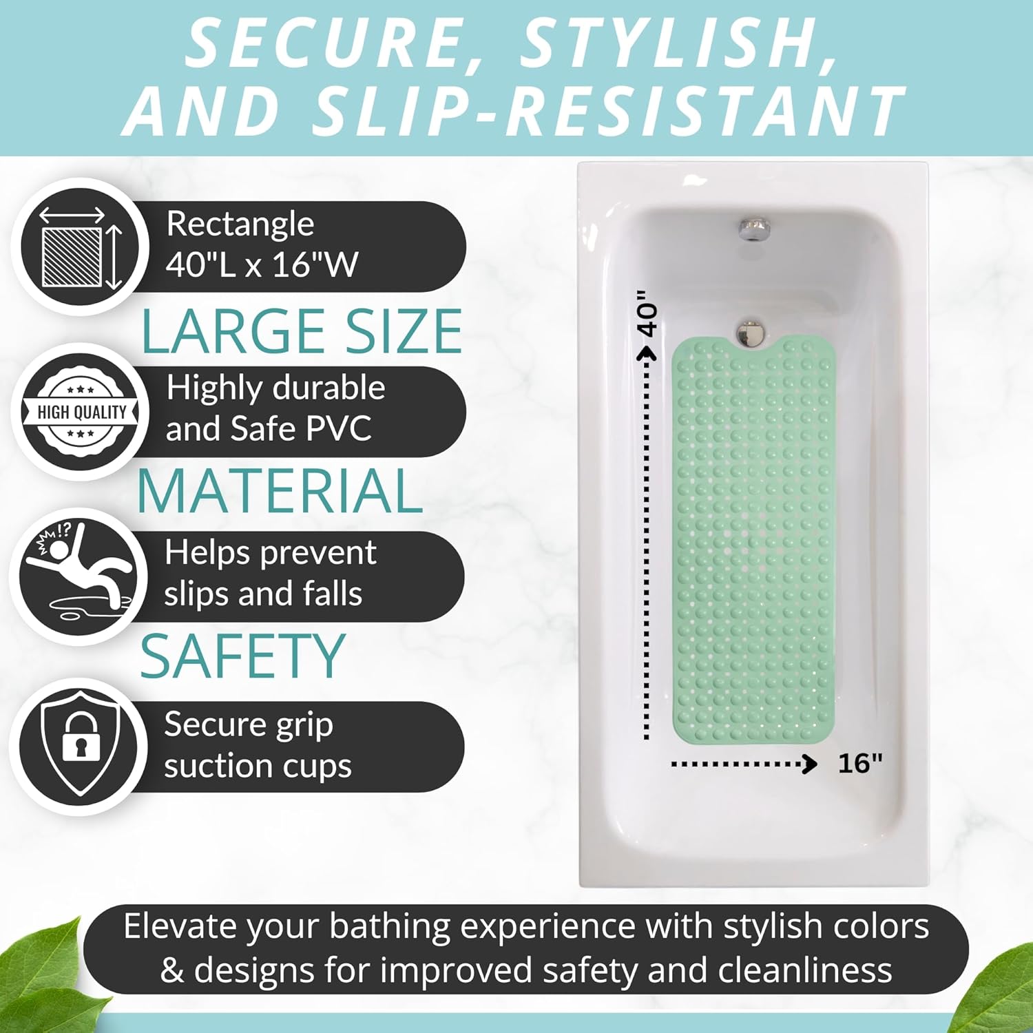• Who Needs Slippery & Small Rubber Mats that put your safety at risk? This ergonomic shower mat comes in extra large, a full 40" x 16" size, to protectively hug your bathtub floor and prevent accidental falls