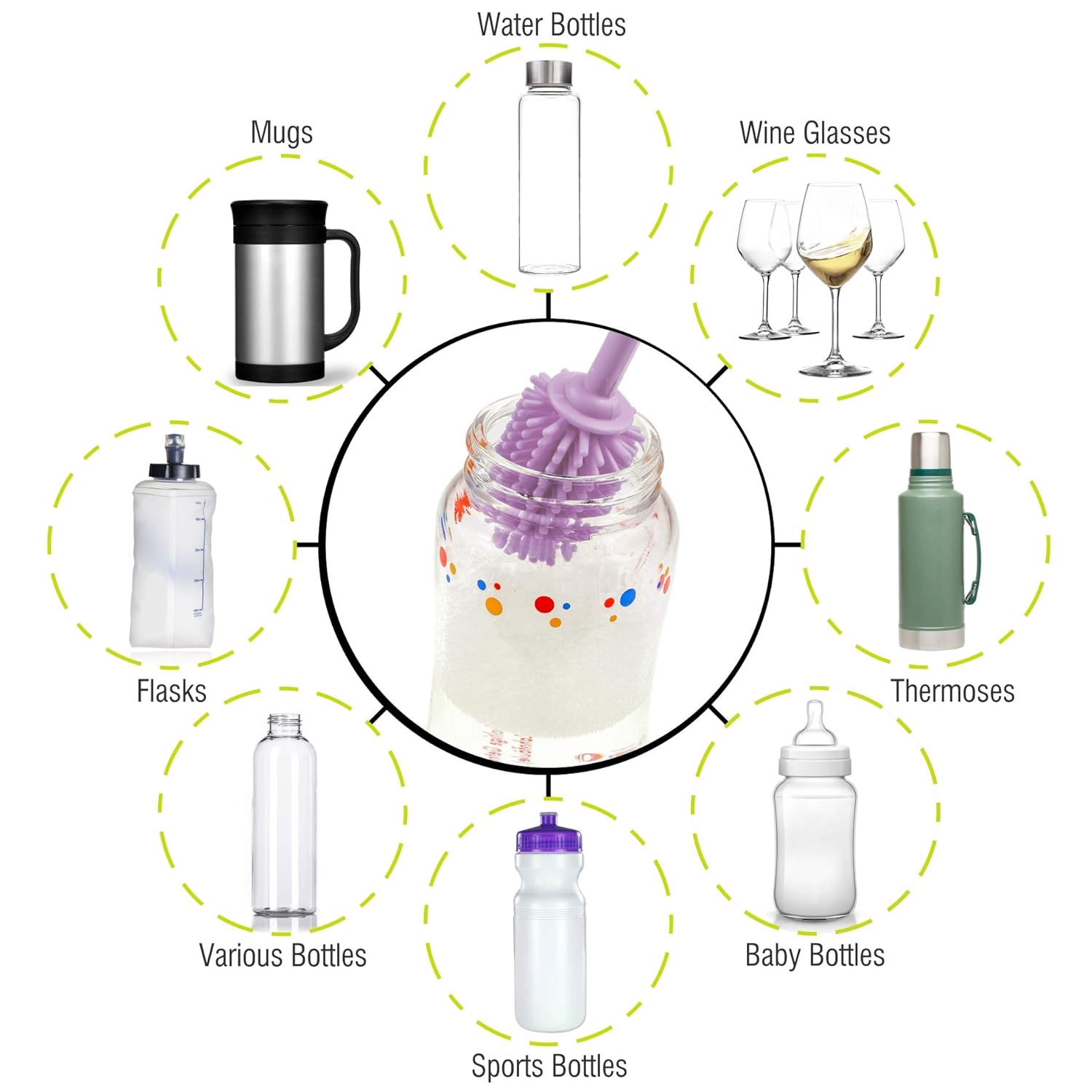 • Long Flexible Handle – Three-piece silicone bottle cleaner brush set for plastic and glass bottles. A multi-purpose dishwashing brush for kitchenware and other containers with hard-to-reach nooks and crannies such as tea/fruit infusers, flasks, coffee makers, tubes, breast pump parts, wine bottles, hummingbird feeders, baby bottles, water bottles, sports bottles, wine bottles, jar, carafes, glasses, thermoses, & much more