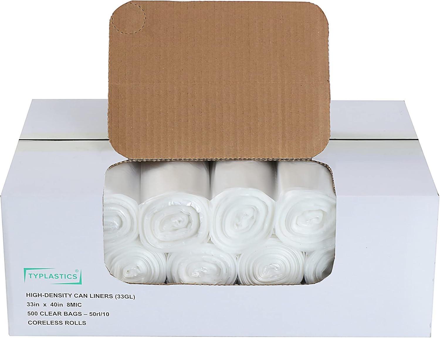 TYPLASTICS 33 Gallon Clear Trash Can Liners - 33" x 40" - High Density Garbage Bags - Case of 500 - Multipurpose for Office, Outdoor, Recycling, Industrial and Commercial
