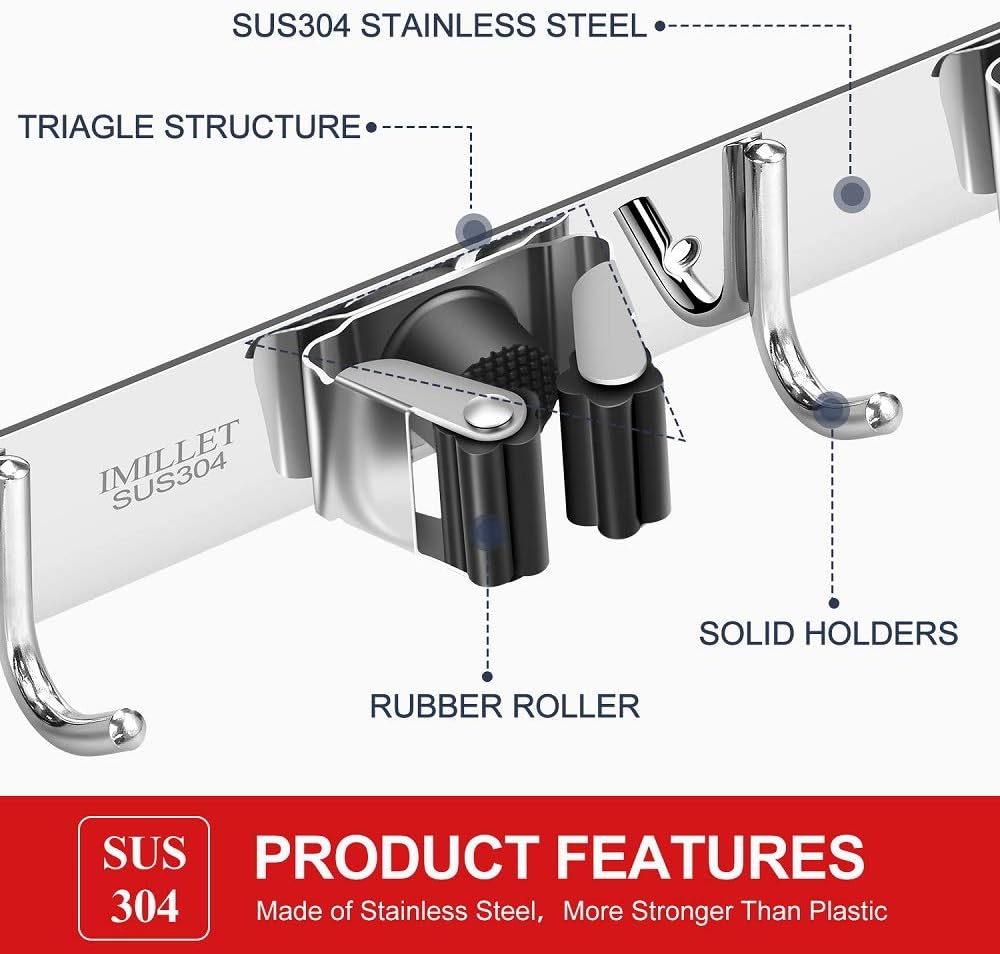 • STRONG & STURDY: Broom organizer wall mount is made of 304 stainless steel, corrosion-resistant, moisture proof and waterproof. Compared with the plastic broom rack, it's more stronger and sturdy. And this broom hanger wall mount can hold up to 200 pounds