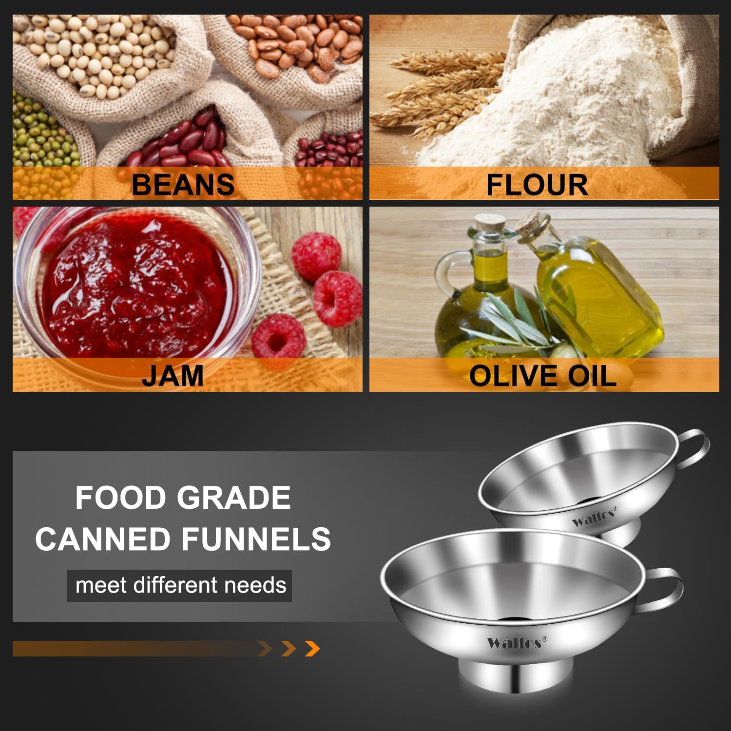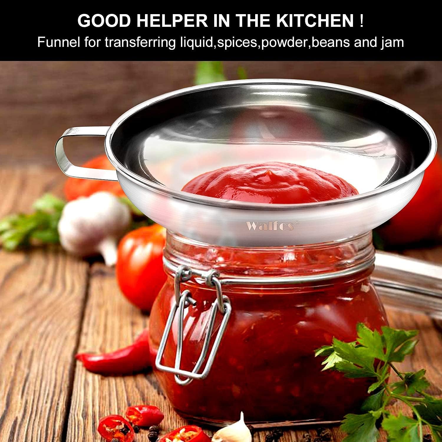• MORE FUN PROJECTS: WALFOS Stainless Steel Funnel is a perfect fit and specially designed to your mason jars, Ball jars, Kerr jars . No matter if you are funneling for canning food, pickling, spices, grains, beans, fruits and vegetables or if you are creating fun art projects with your kids, or food gifts to share with friends and family, this food grade funnel will make all your projects easy and breezy