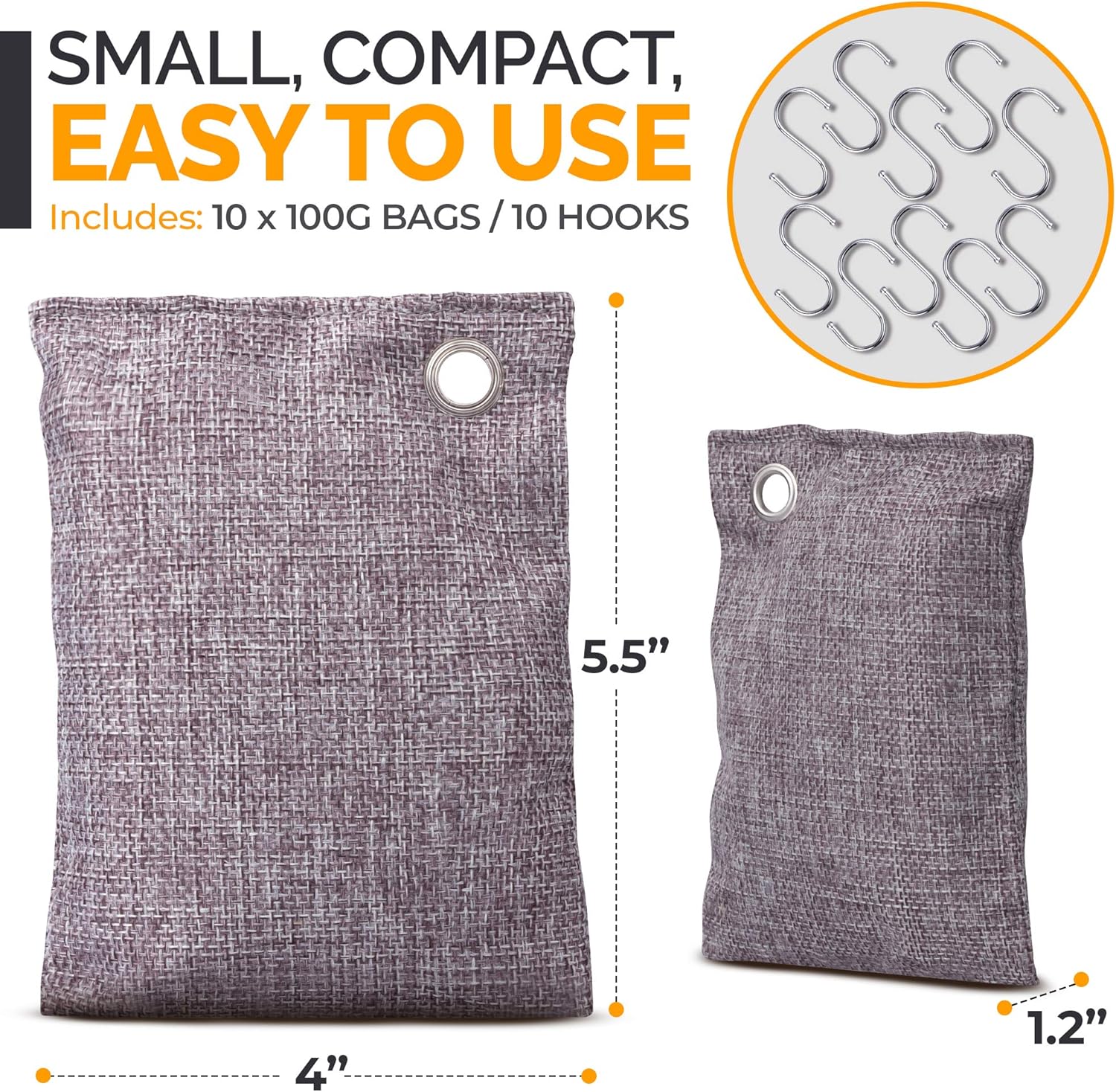 • 10 CHARCOAL DEODORIZER BAGS WITH HOOKS. Our 3.5oz bamboo charcoal bag musty smell eliminators are the perfect size to place wherever you have a bad smell: closet, car, shoes, gym bag, basement, pet areas.