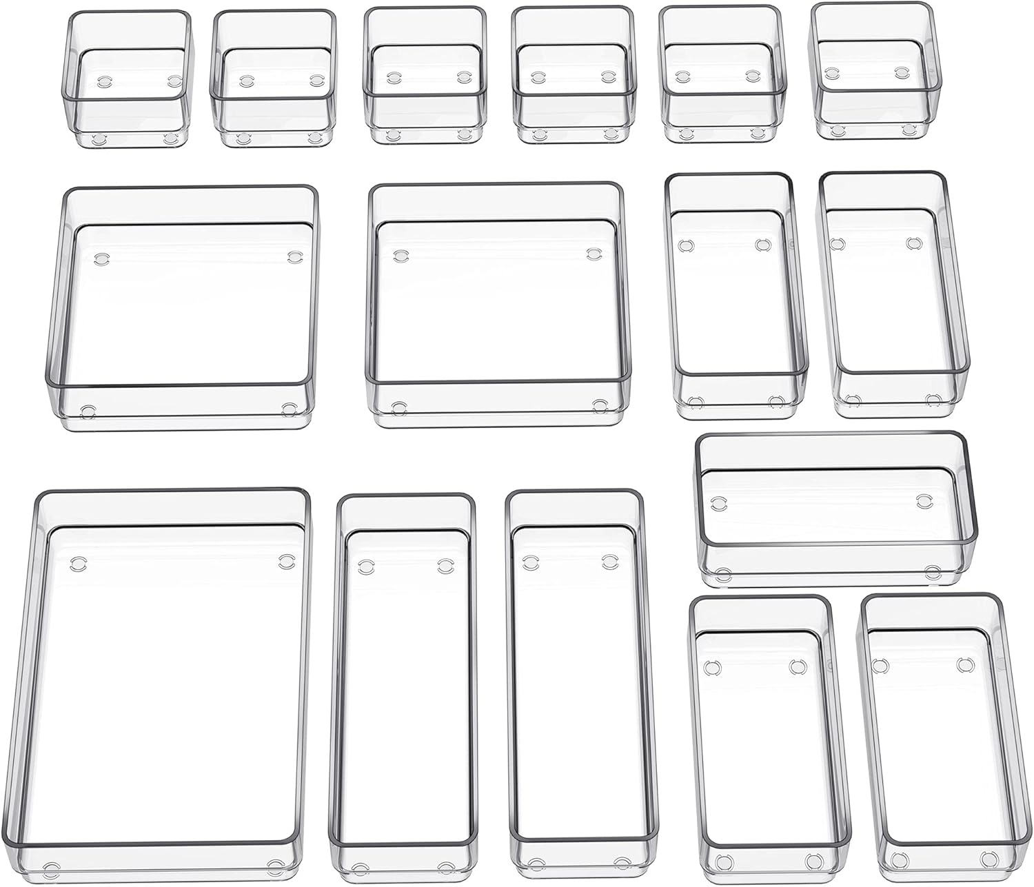 • Multiple Sizes - 5 different sizes and 16 pieces trays offer you customize combinations to store stuff and organize drawer for your specific needs. Size: 8.9 x 6 x 2 inches (1 pack), 5.9 x 5.9 x 2 inches(2 packs), 8.9 x 3 x 2 inches(2 packs), 5.9 x 3 x 2 inches(5 packs), 3 x 3 x 2 inches(6 packs).