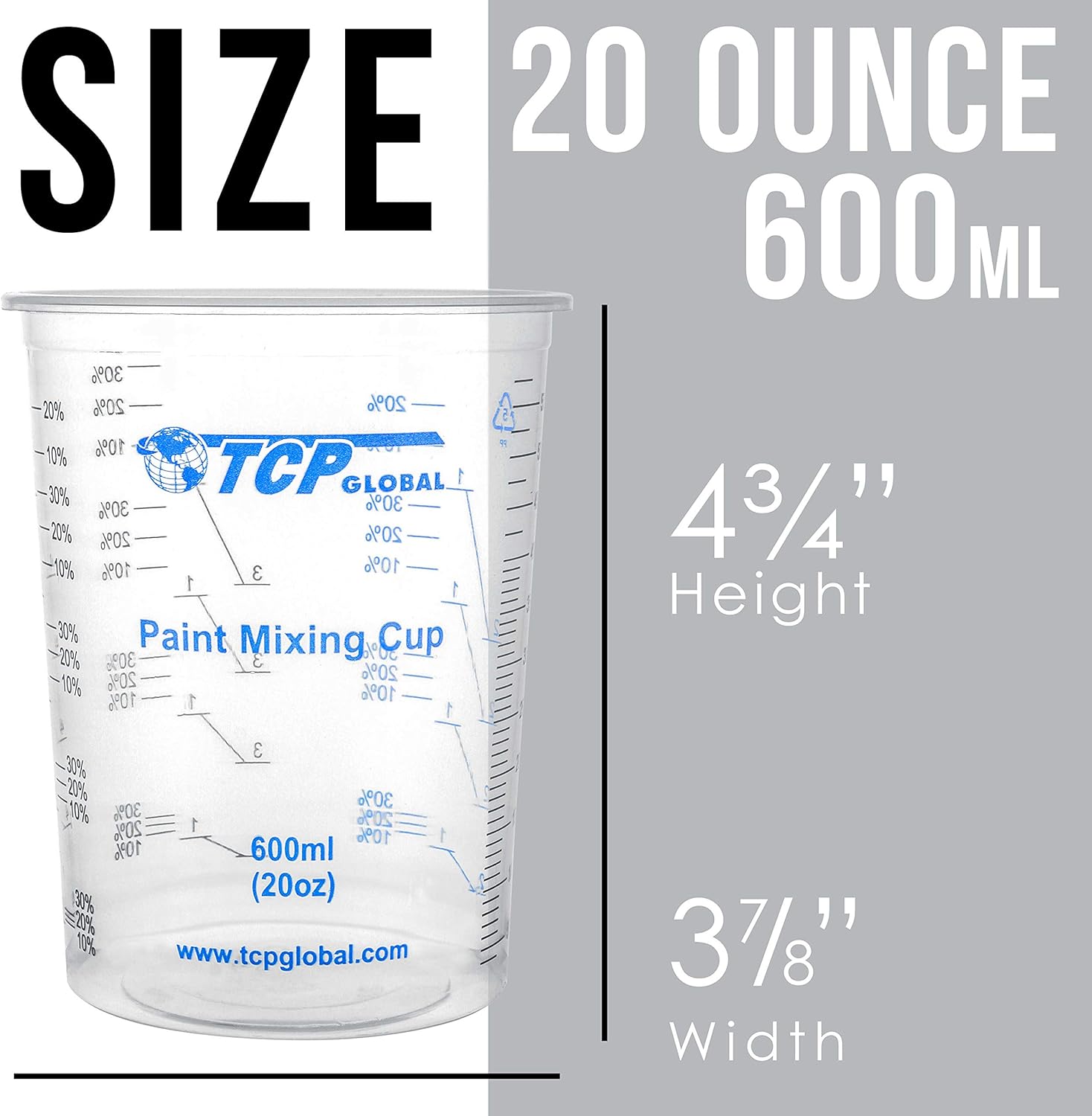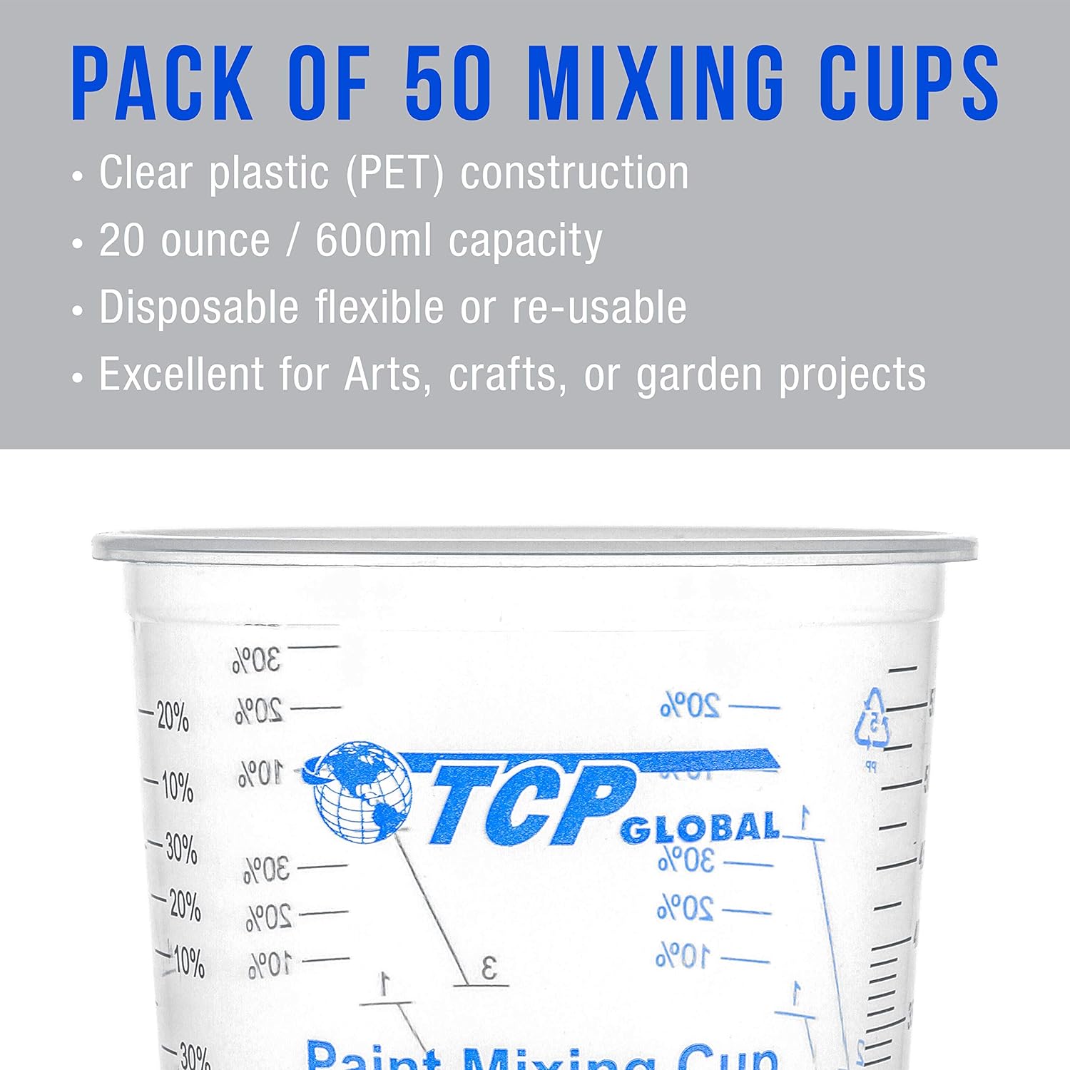 TCP Global 20 oz. (600ml) Graduated Plastic Mixing Cups - Box of 50 with 50 Mixing Sticks - Disposable Plastic Measuring Cups for Liquids, Paints, Resin, Epoxy, Art, Kitchen - Ratios 2-1, 3-1, 4-1 ML