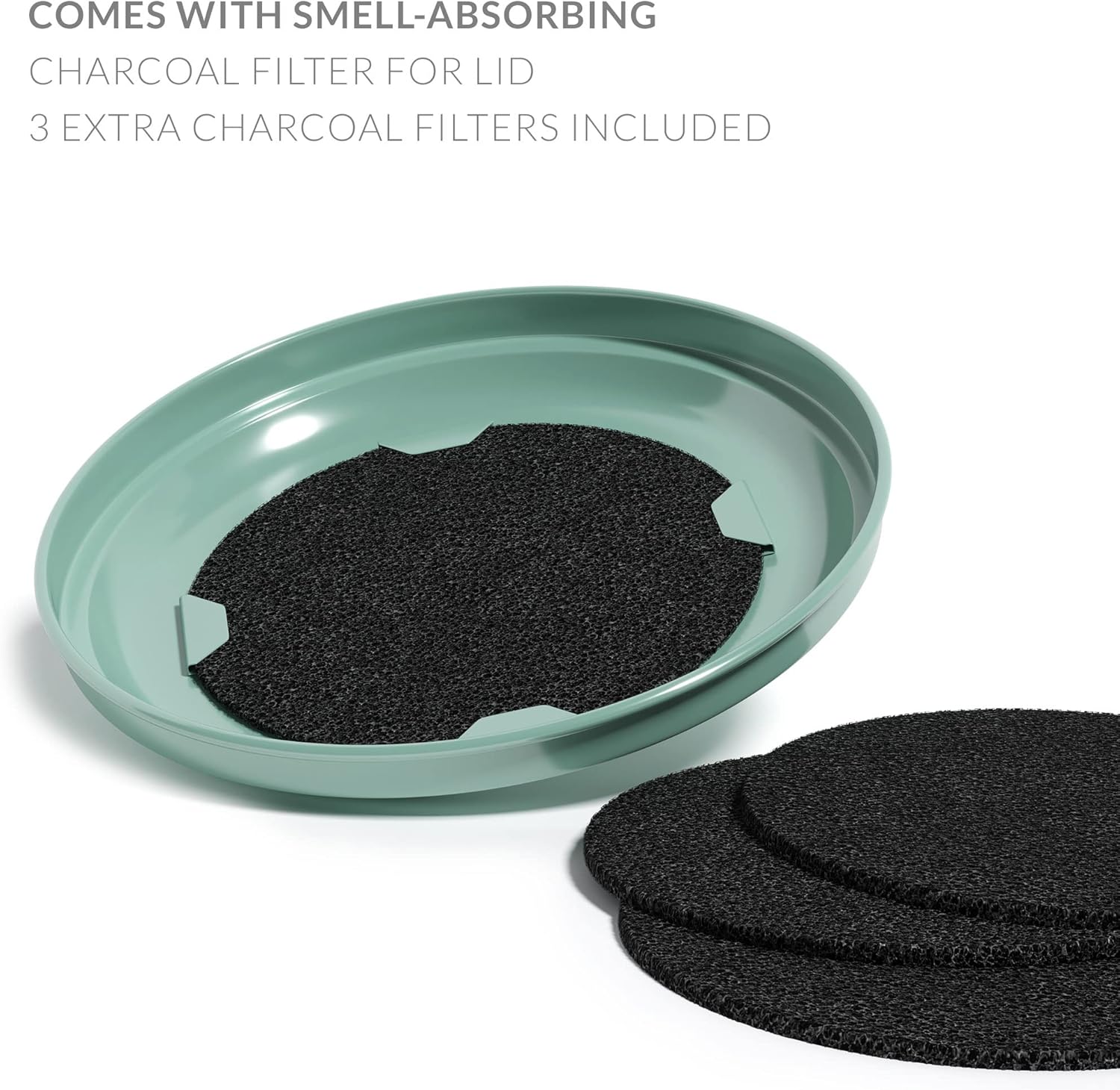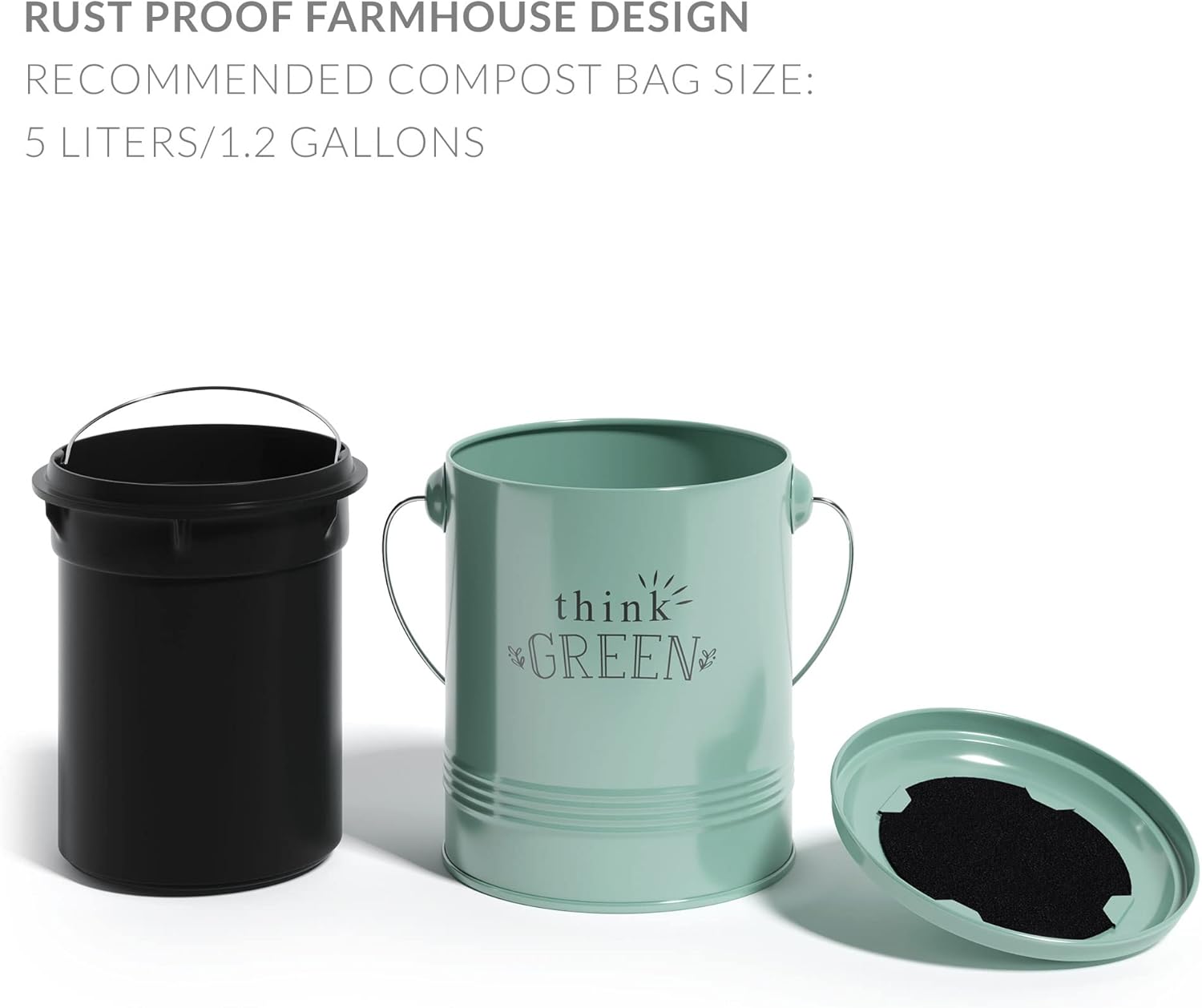 • Dimensions - Our small compost bins for kitchen measure 7"D x 9.5"H w/ lid. Height w/out lid: 7.75"H. Intended for indoor use or under protected outdoor space. Material: Galvanized steel. Rust proof. Compost bag size: 5 liters/1.2 gallons. Comes with 3 extra filters. It's recommended to change filters every 3 months. Color: Mint.