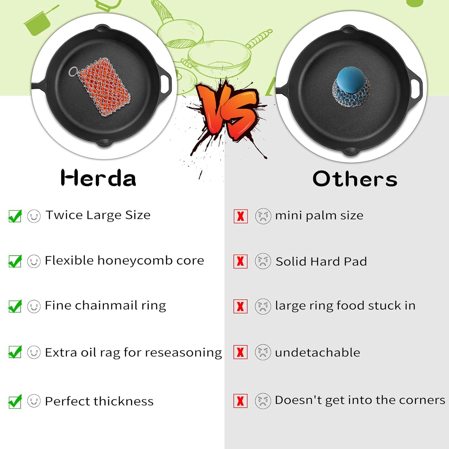 • 【Large Size Cast iron scrubber】TWICE LARGER than mashroom style chain mail scrubber help improve the cast iron cleaning efficiency and save your time. Herda silicone chainmail scrubber Linked with 3mm small fine chainmail ring, Leave the dirt nowhere to hide.
