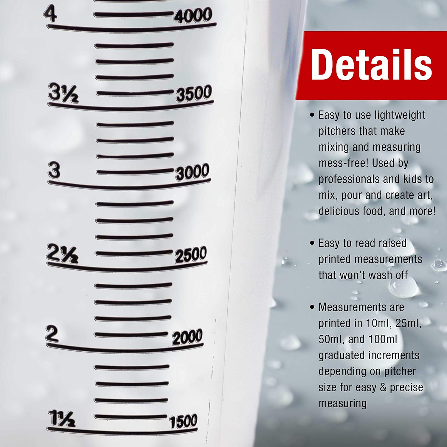 • Easy to use lightweight pitchers that make mixing, measuring, and pouring mess-free! Used by professionals and kids to mix, pour and create art, delicious food, and more.