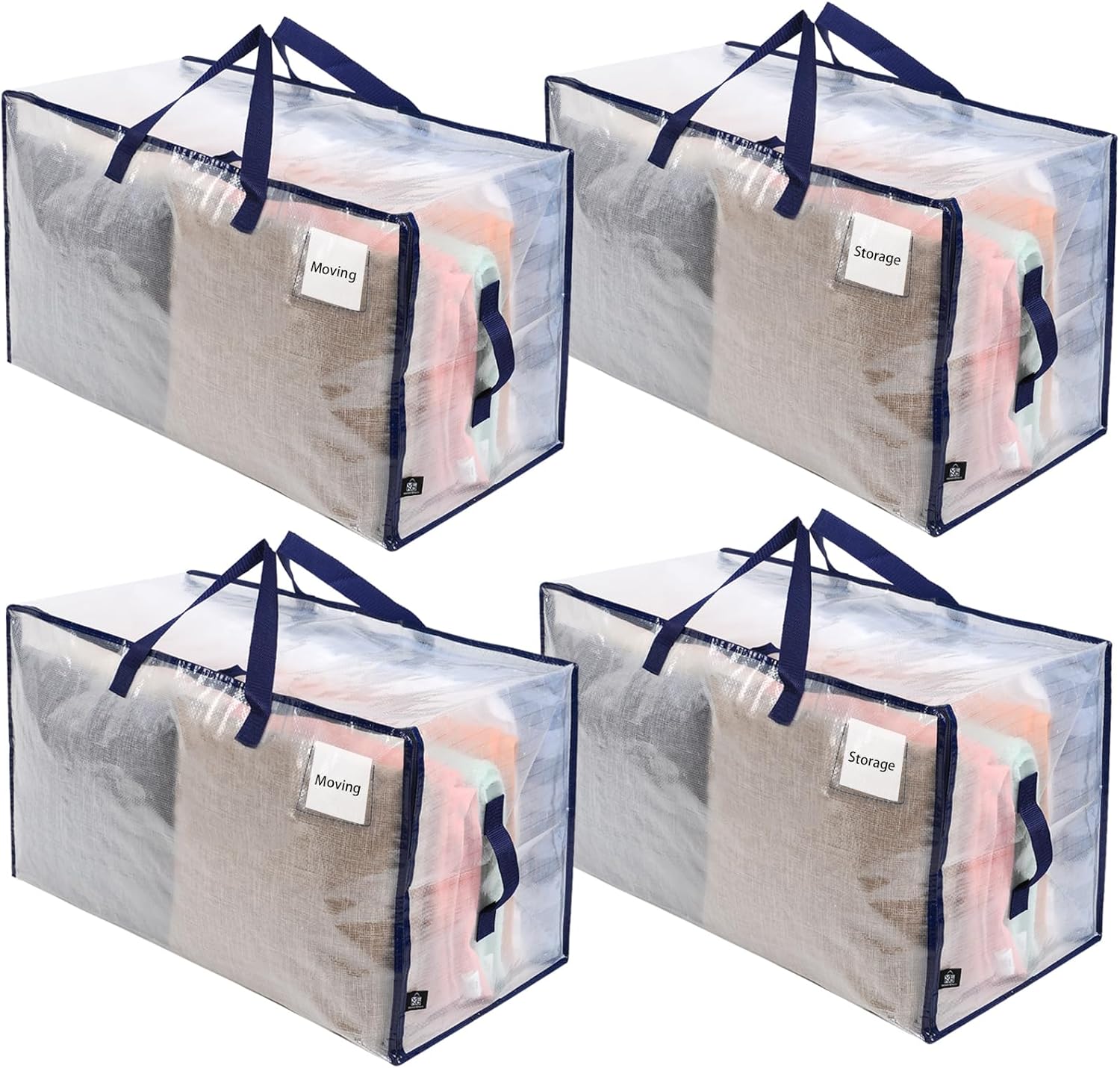 VENO 4 Pack Moving and Storage Bags, Heavy Duty, Alternative to Moving Boxes, Large Packing Totes Supplies for College Dorm Room with Zipper for Clothes, Wide Open Design (Clear, 4 Pack)