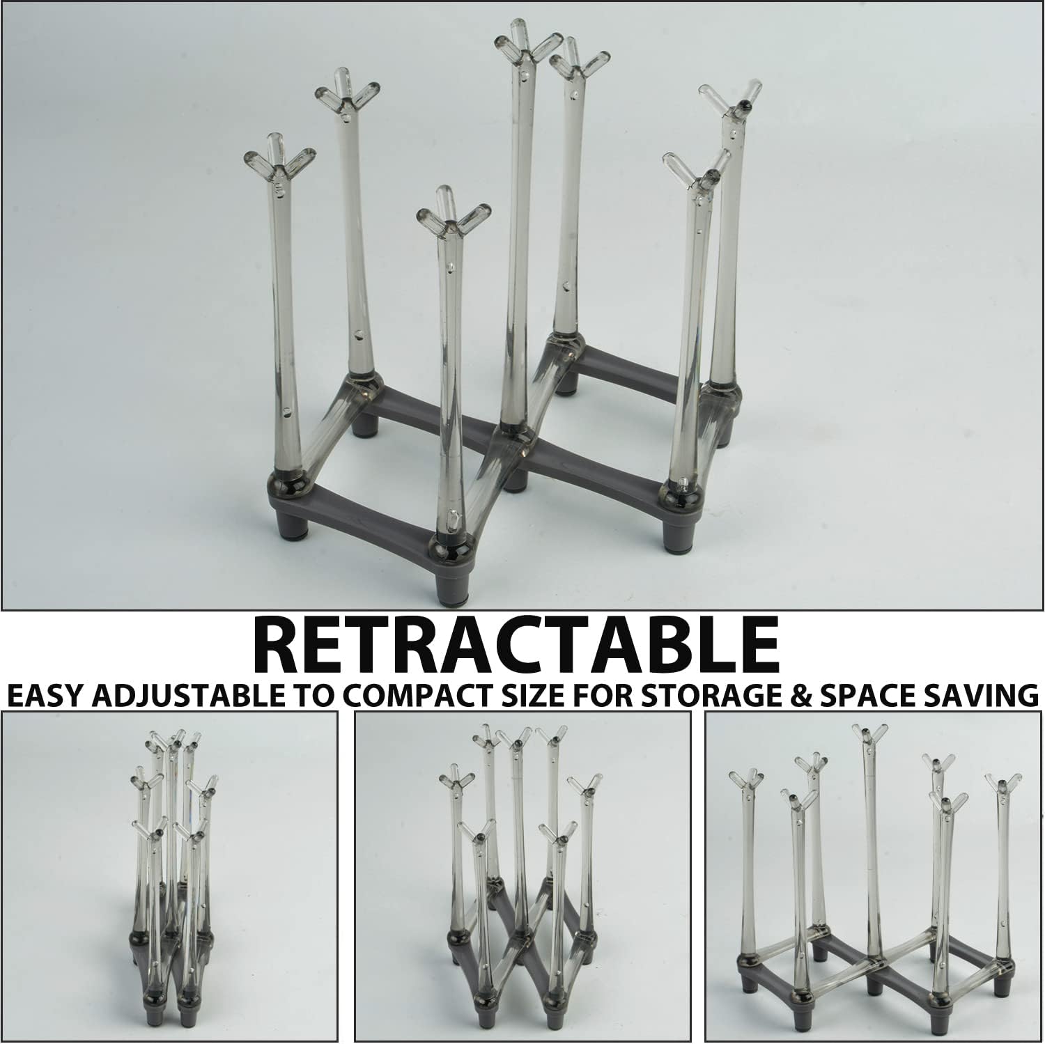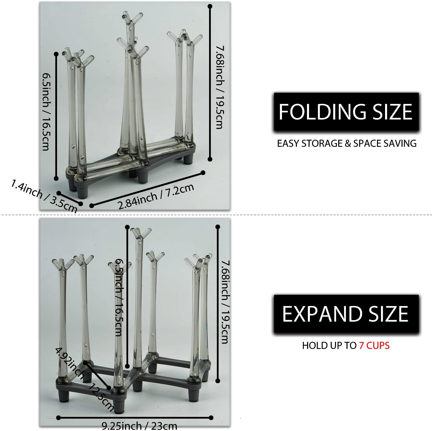 • Unique Retractable Design: The foldable cup drying rack can be easily adjusted to fit cups, mugs or bottles of different sizes, to meet different demands of using. When fully folded, the size is only about 19.5 x 17 x 5 cm (7.68 x 6.69 x 1.97 inch), very easy to store when not in use.