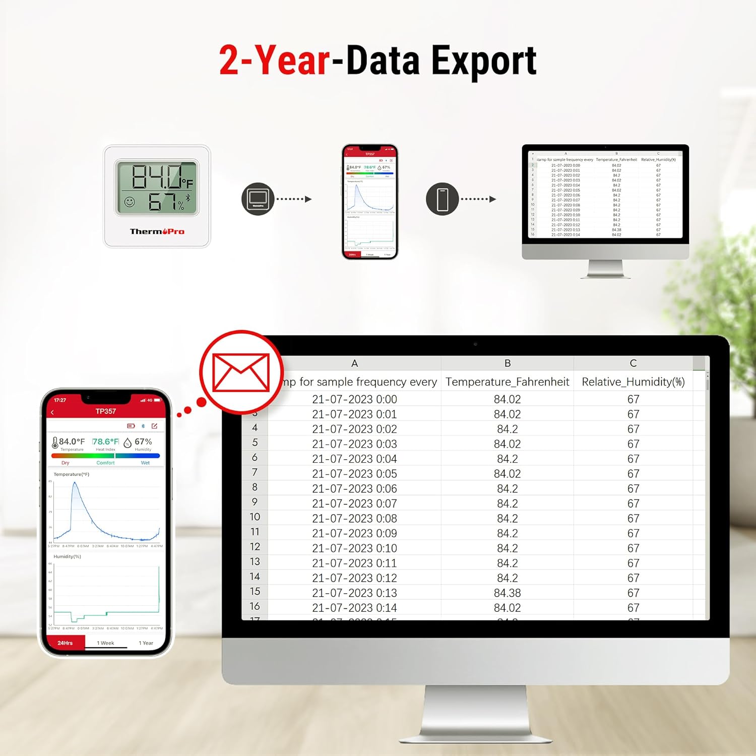 • Smart App with Alerts: Set a temperature gauge range via the ThermoPro Sensor and instantly receive a phone notification if the temp and humidity monitor levels fall outside of your range, allowing you to quickly react to make necessary adjustments; Have a private and secure App! ThermoPro App do not register user information, which further protects user privacy