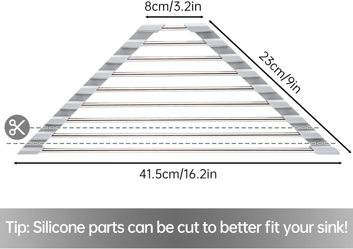 • ✔️【Customizable Size】Tailored to optimize your kitchen sink corner space with a triangular design. Too big? Simply use scissors to cut the silicone sides for a perfect fit. It's a handy tool that allows you to easily rinse and dry small items to keep your kitchen clean. Ideal for accommodating sponges, brushes, hand soap, dishes and more. Bottom Length: 16.2”, Side Length: 9”, Upper Length: 3.2”.