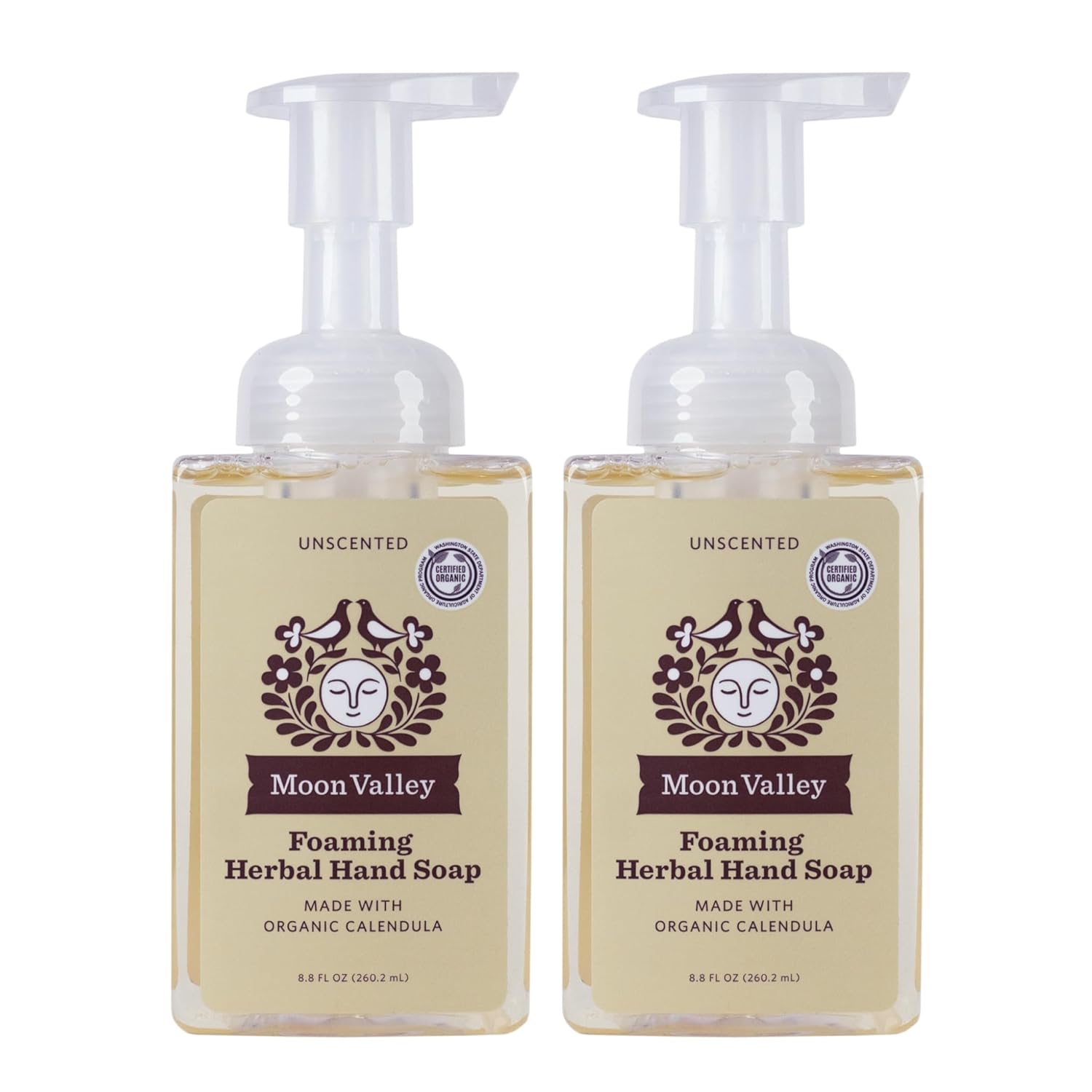 • TWO-PACK: This bundle includes two 8.8oz Unscented Foaming Hand Soaps. Moon Valley Herbal Foaming Hand Soaps are certified organic, vegan and non-gmo. Each bottle is recyclable. Ingredients leave hands soft and moisturized