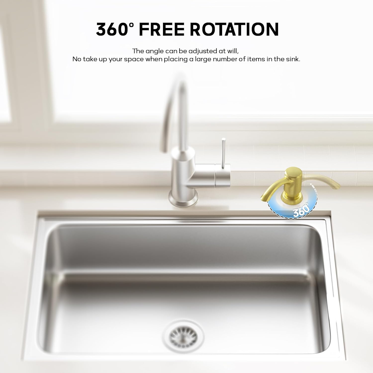 • 【Versatile Design】- Our soap dispenser is designed to work with a variety of liquid products, such as hand soap, lotion, and detergent. The 360-degree swivel feature allows for use from any angle, maximizing counter space efficiency.