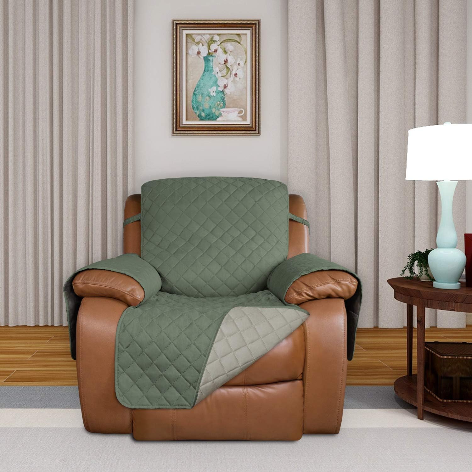 PureFit Reversible Quilted Sofa Cover, Water Resistant Slipcover Furniture Protector, Washable Couch Cover with Non Slip and Elastic Straps for Kids, Dogs (Oversized Recliner, Greyish Green/Beige)