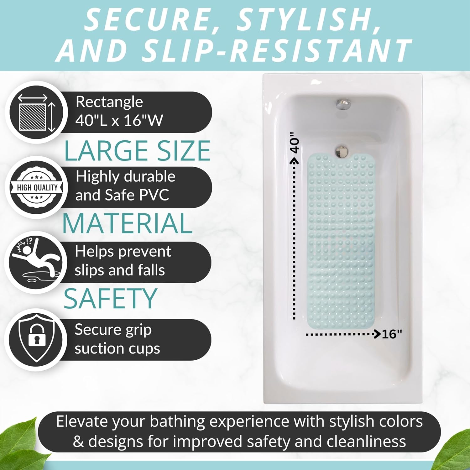 • Who Needs Slippery & Small Rubber Mats that put your safety at risk? This ergonomic shower mat comes in extra large, a full 40" x 16" size, to protectively hug your bathtub floor and prevent accidental falls