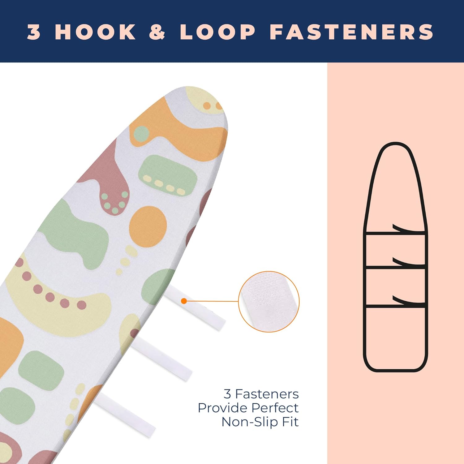 • 3 HOOK AND LOOPS, NOSE POCKET AND ELASTIC EDGES PROVIDE PERFECT NON-SLIP FIT - Elasticized edges, nose pocket and 3 hook and loops design fits the board perfectly. Slipping and the exposure of the edges will be prevented by this. Providing you to have wrinkle free clothes in a shorter time. This ironing board cover and pad is designed for standard size boards (15x54 inches).