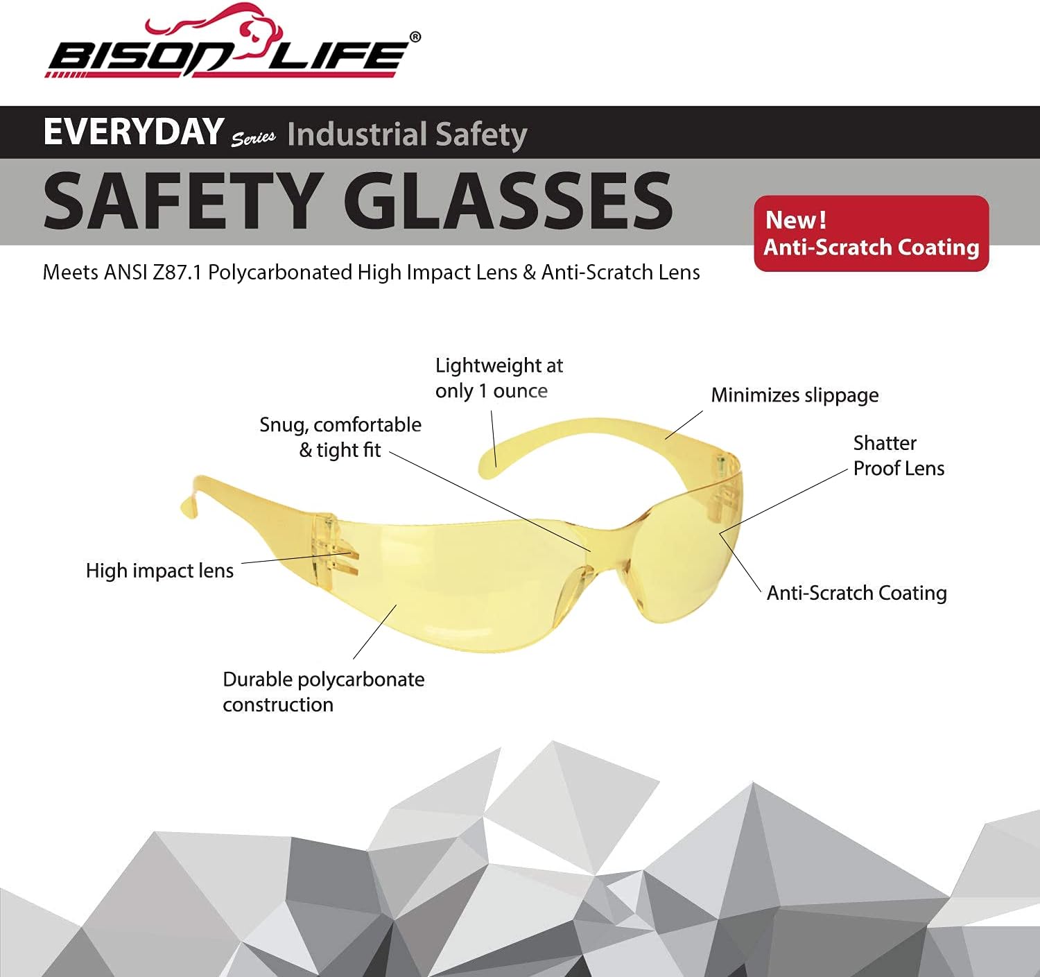 BISON LIFE Safety Glasses - Scratch Resistant Wrap Around Eyewear, Polycarbonate ANSI Z87.1 Impact Resistant Lens