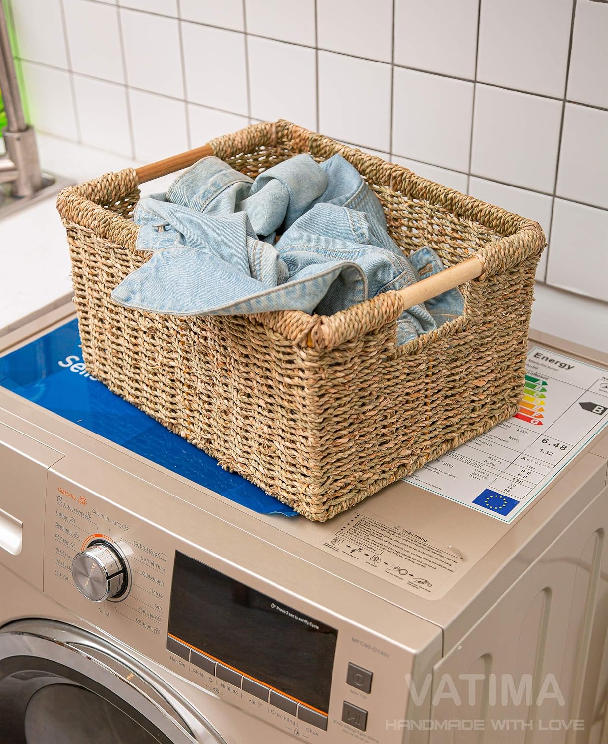 • ✅ WICKER BASKETS - Whether it be by way of pure decor, storage, or organization for kitchen, pantry, or bathroom. This natural Seagrass basket suit your home in every way. The rectangular storage basket is great for magazines, games, pet toys, media, household items.
