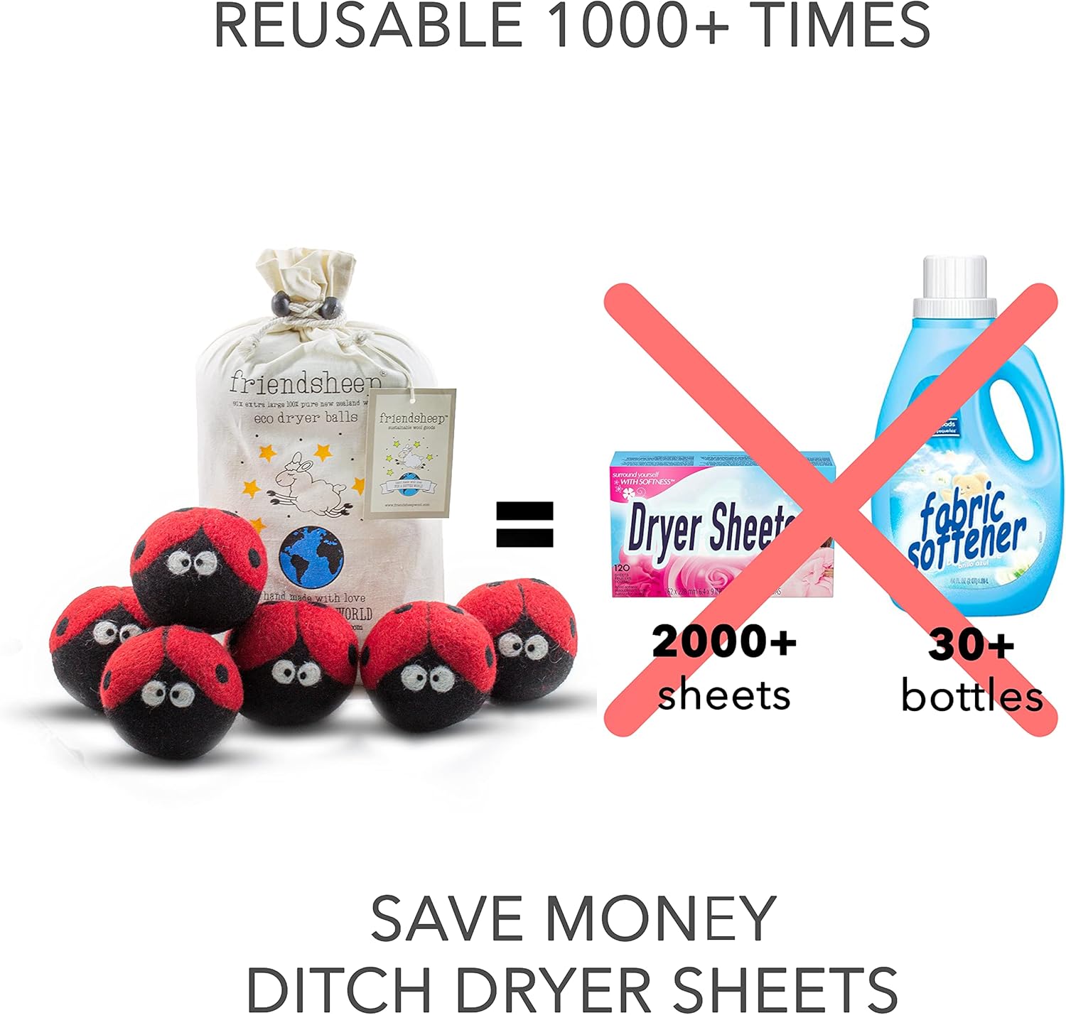Friendsheep Wool Dryer Balls 6 Pack XL Organic Premium Reusable Cruelty Free Handmade Fair Trade No Lint Fabric Softener Ladybugs - Laundrybugs