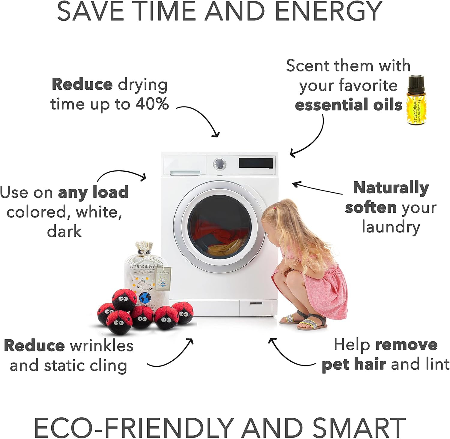 • ECO-FRIENDLY AND REUSABLE FOR 1000+ LOADS, replaces dryer sheets & liquid fabric softeners. Makes your laundry soft and fluffy, reduces wrinkles and static cling, and shortens drying time by up to 40% depending on load size. Your sheets and towels are fluffier, less balling and twisting. Makes you SAVE TIME, ENERGY, AND MONEY! All by keeping safe and healthy you, your family and the environment.