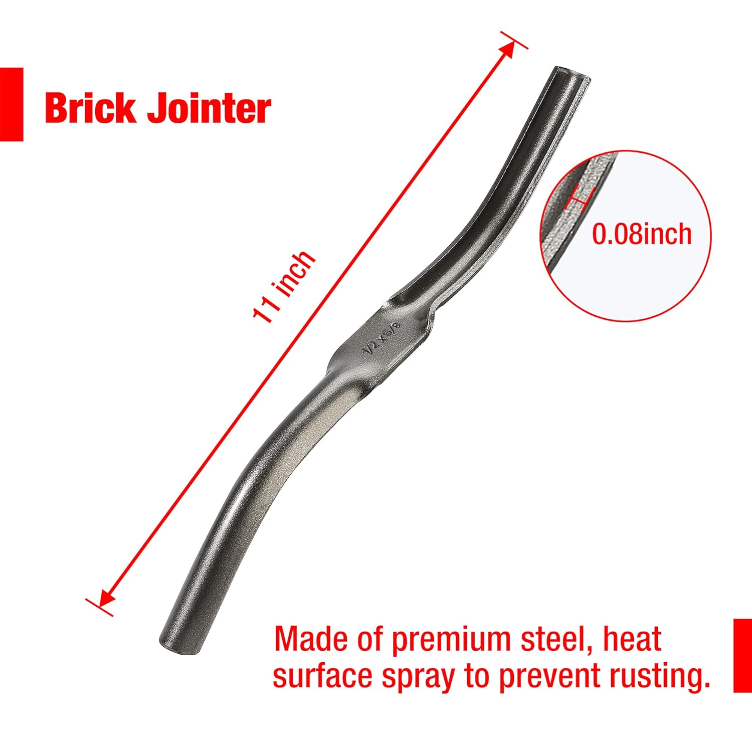 • Heavy Duty Mortar Jointer - Made of high quality steel, heat treated for maximum strength, surface spray to prevent rusting, will last for long lifespan. Size 1/2 in. & 5/8 in.
