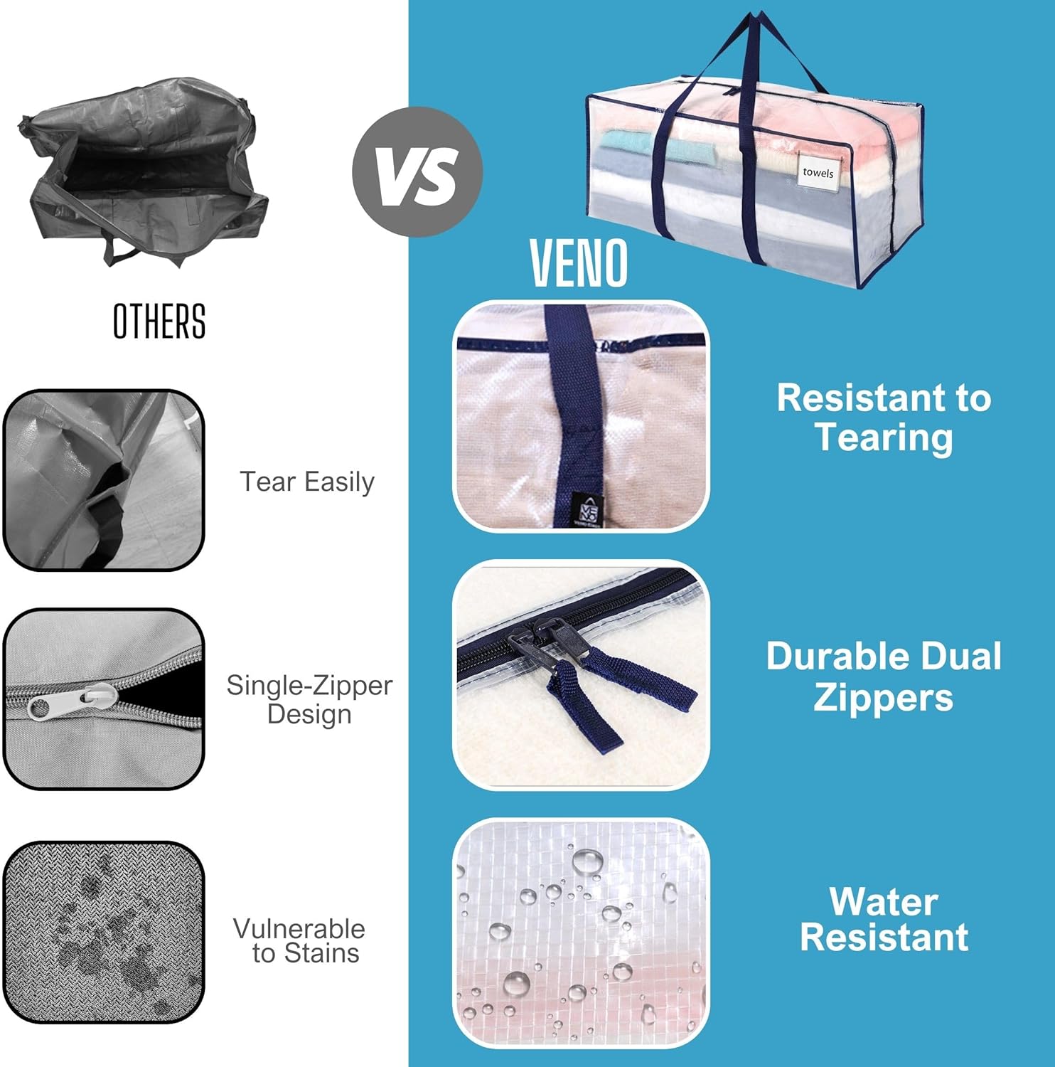 VENO 8 Pack Moving Bags Plastic Storage Totes Clothes Organization Large W Lid/Zipper. Packing Boxes/Bins Alternative. Space Saving Foldable College Supplies Essentials (Clear, 8 Pack)