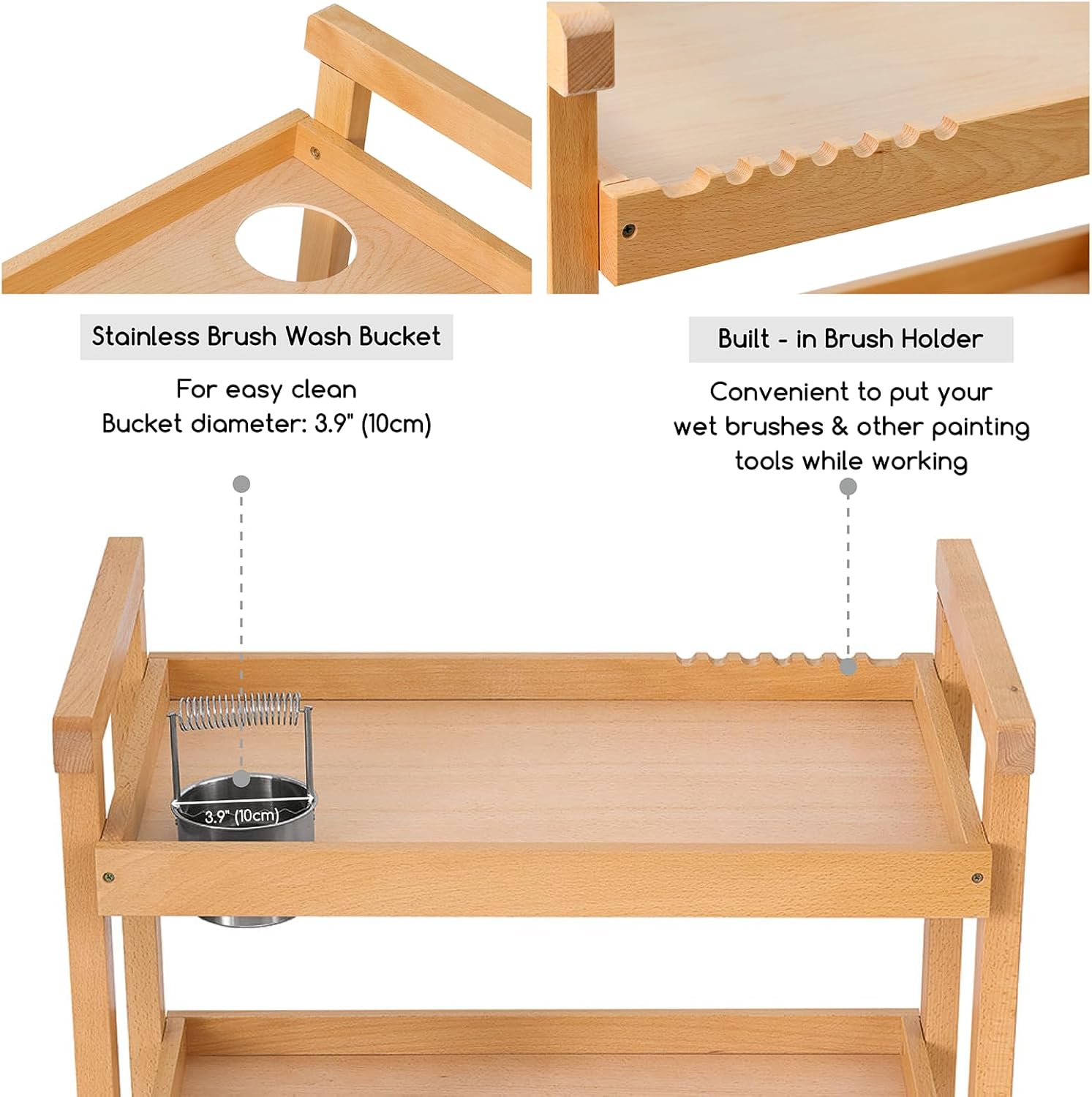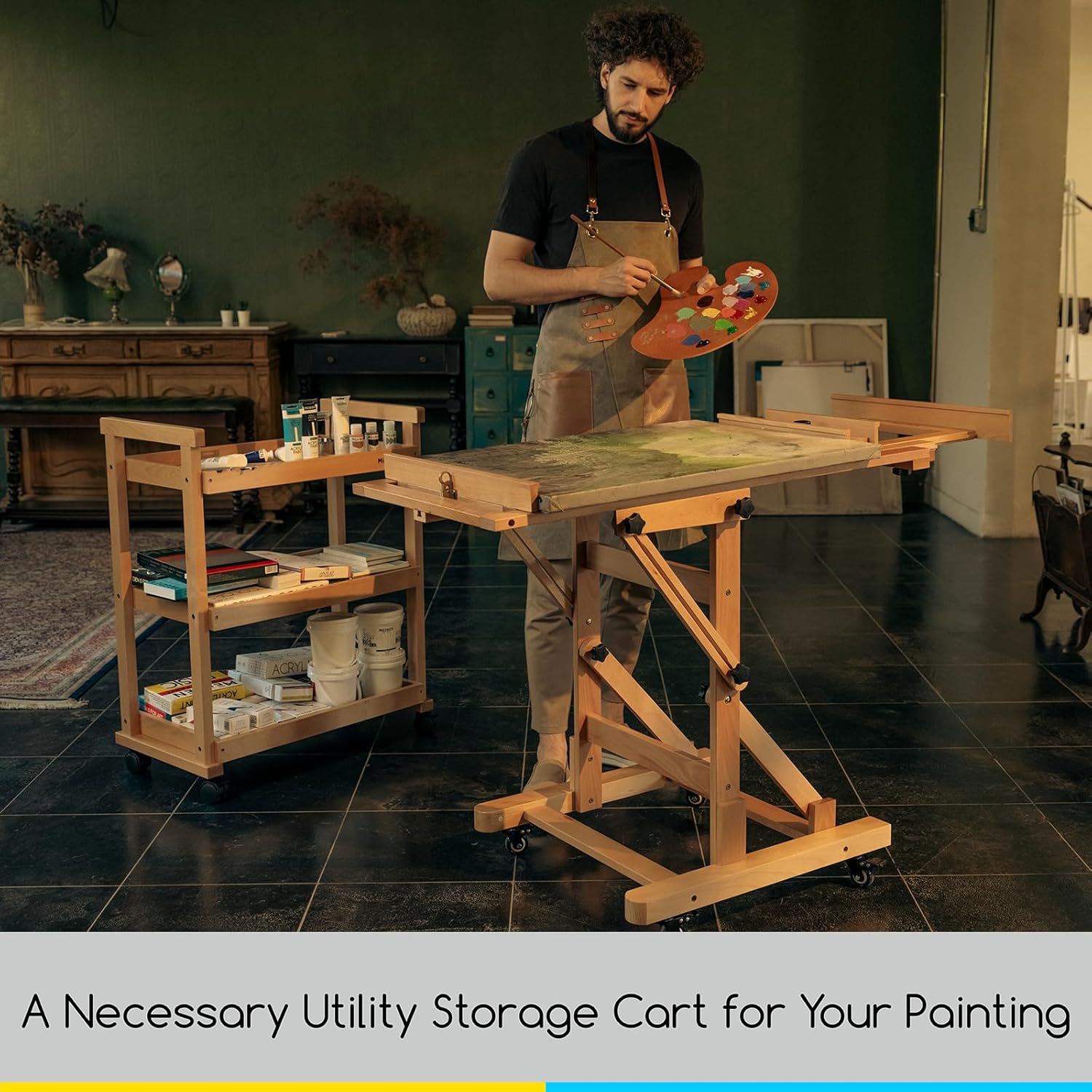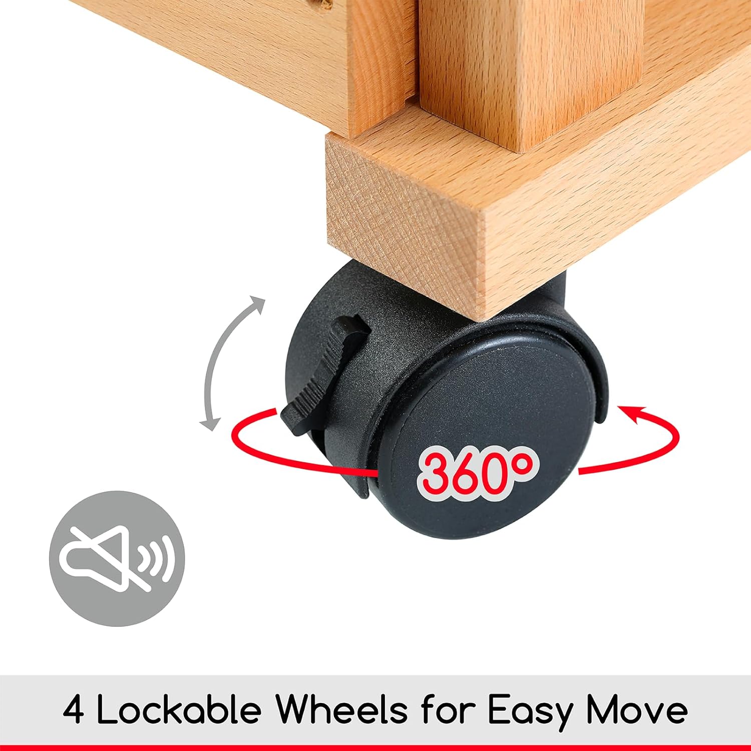 • SOLID BEECHWOOD STUDIO ART CART: The wood storage trolley art cart in size 35'' x 28-1/3'' x 15-3/4'', made of solid beechwood, natural, light-weight, and sturdy. It can hold weight up to 88lbs. Oil finished surface is super smooth and ZERO-glitch. Hand-sanded corners and edges provide maximum security.