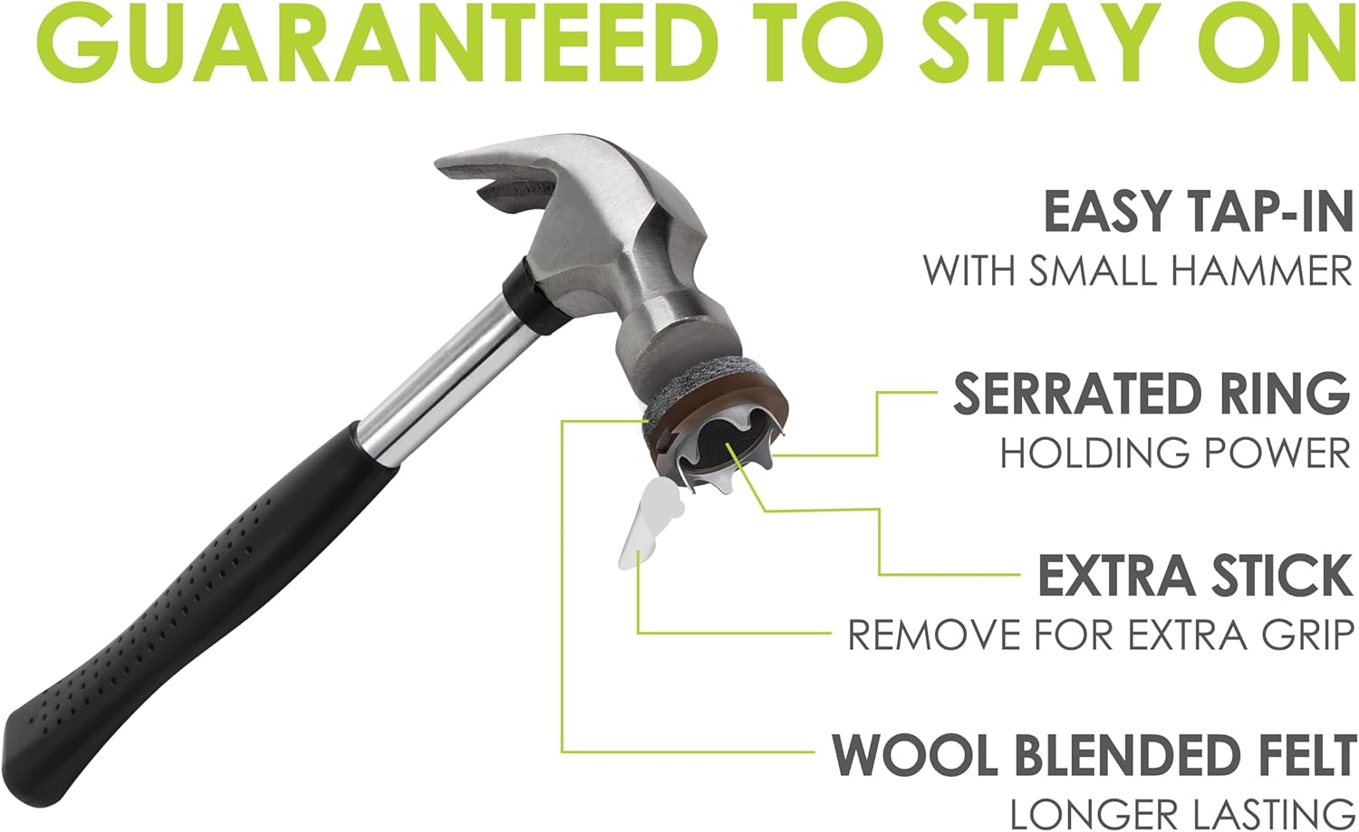 • Quick & easy tap on installation – Includes 16 x 1 inch round felt chair feet pads that install in seconds with the tap of a hammer, simply clean the bottom of furniture leg, peel off adhesive backing from glide, position on furniture and then tap on premium felt furniture pads. Not for use on metal furniture legs or furniture legs that can't be hammared into - please see peal & stick GorillaFelt furniture pad options.