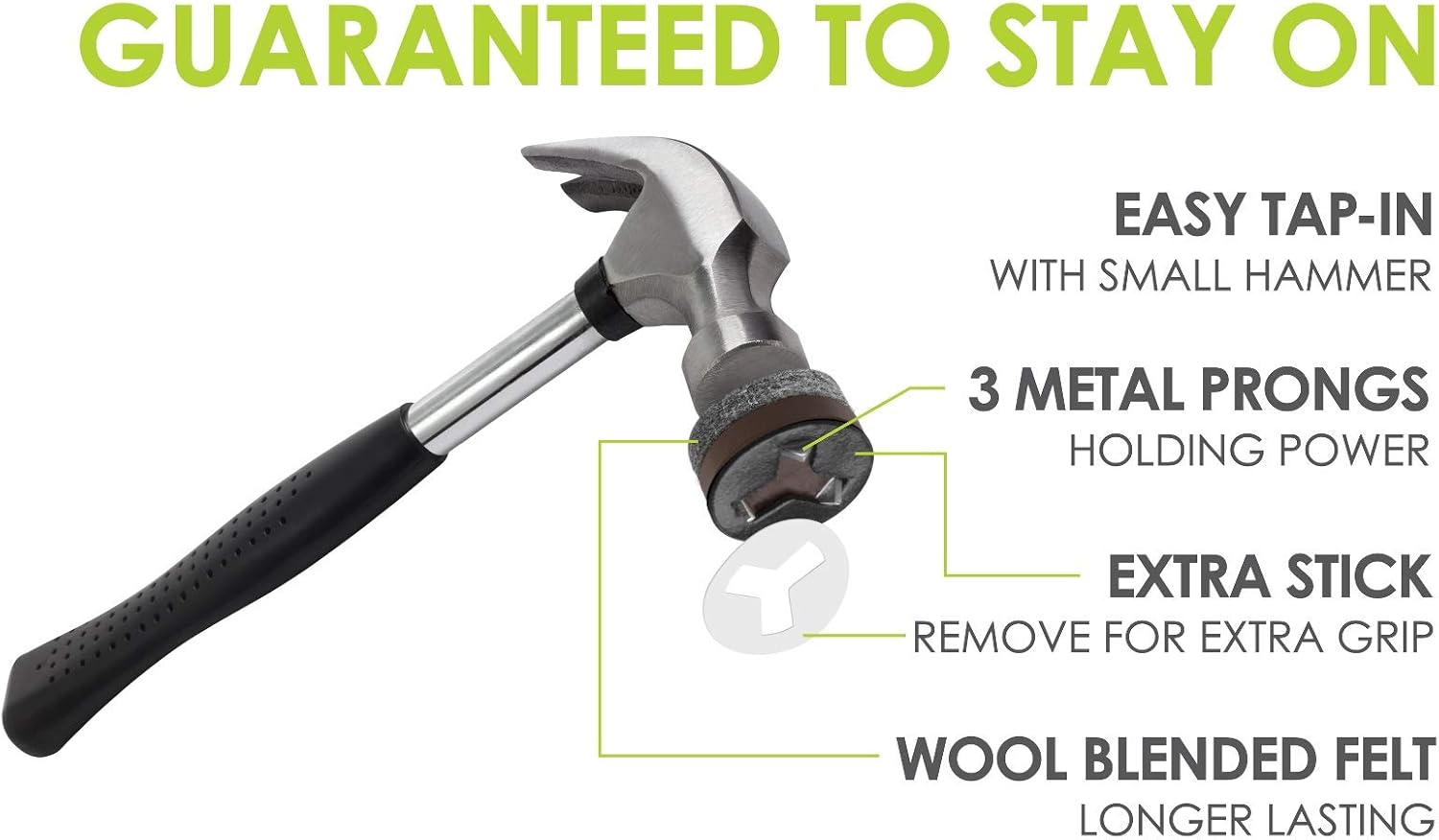 • Quick & easy tap on installation – Includes 16 x 3/4 inch round chair feet pads that install in seconds with the tap of a hammer, simply clean the bottom of chair legs, peel off adhesive backing from glides, position on furniture and then tap in felt furniture pads. Not for use on metal furniture legs or furniture legs made of hard material that can't be hammered into.