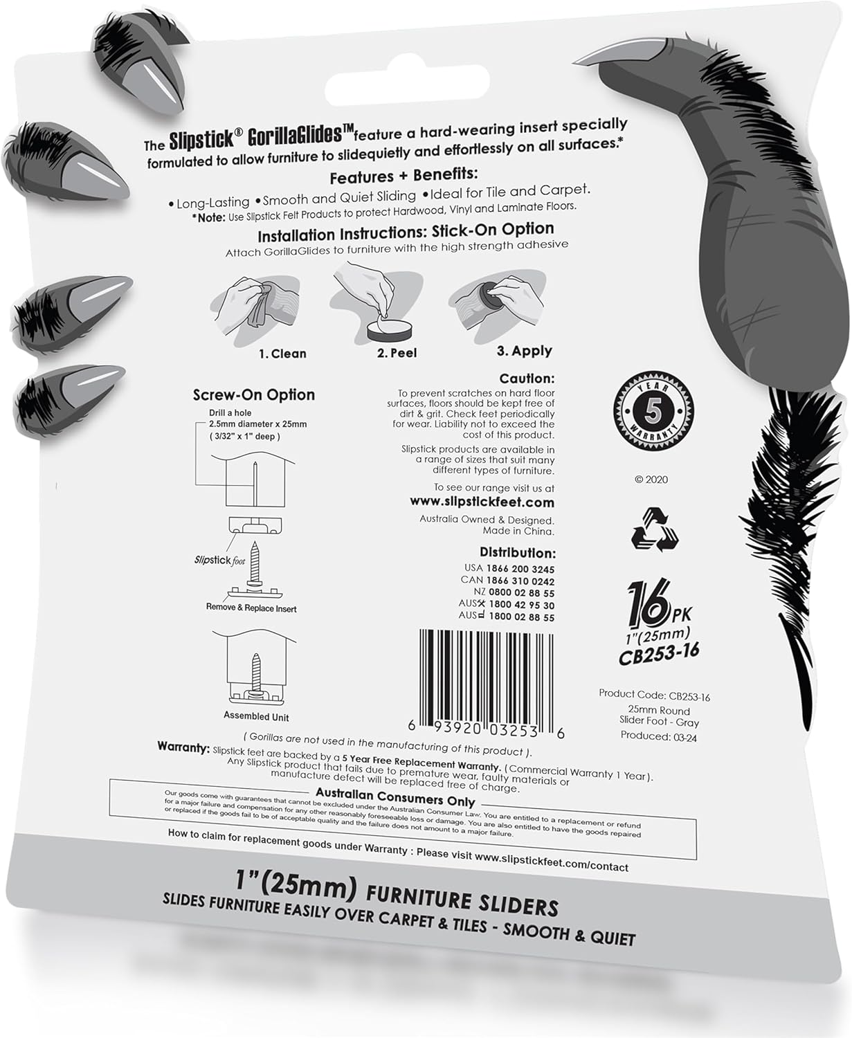 • GorillaGlides 1 inch furniture sliders by Slipstick are covered by a free replacement warranty should any product fail due to premature wear or defect. Furniture glide slider caps can be replaced and are sold separately, see GorillaGlides model CB254 1 inch plastic slider insert caps.