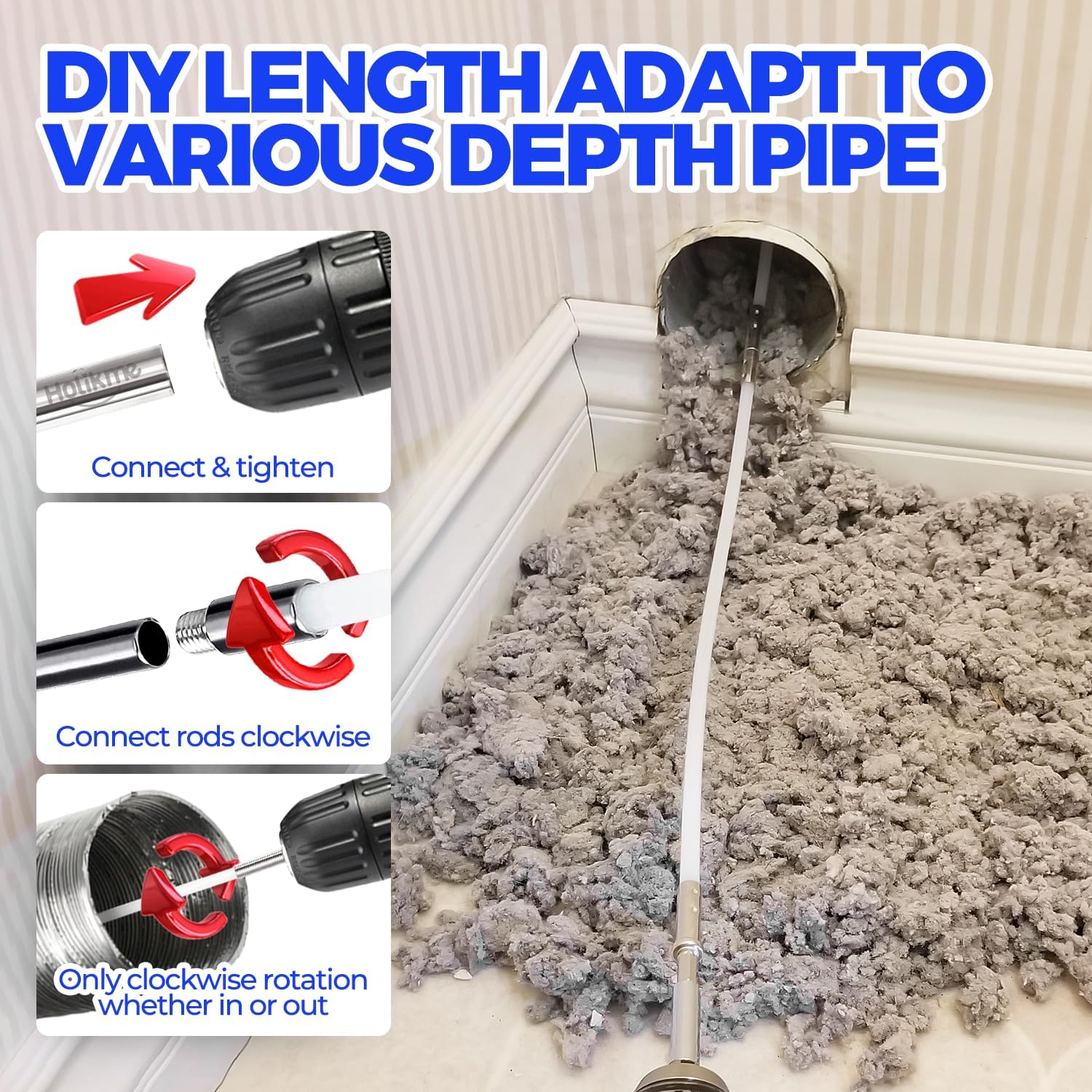 • Easy to Use & Effortless for Good Cleaning: Our dryer vent cleaner kit can be used with or without any kind of power drill and will help you achieve professional results. Just always turn the rod clockwise and keep moving in&out slowly. Kindly remind that while cleaning around corners and turns or stubborn lint trap, slow down and then accelerate slowly.
