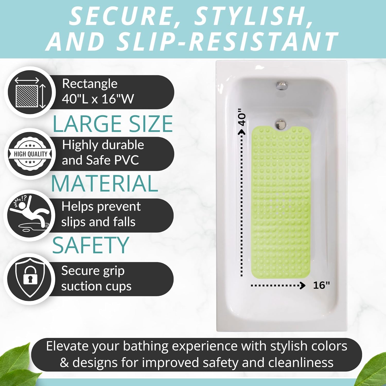 ENKOSI Bath Mat - Large Non Slip Bathtub & Shower Mat - Extra Long 40 x 16 Inch Bathroom Mats for Tub Nonslip Anti Slip Bathmats (40x16 Green)