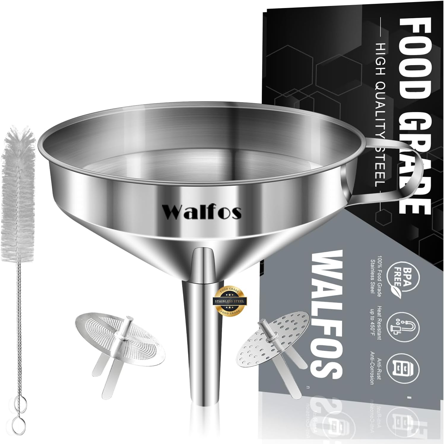 • EASY TO USE & CLEAN - Stainless steel funnel has a side handle to conveniently hold the funnel over a jar, pot or pan. With convenient loop on the side, you can put it in kitchen cabinets, hang in garages, stored in utility rooms or anywhere you can put it. Easy to clean by simply washing with soapy water after use. It is also dishwasher safe (WALFOS RECOMMEND:Please clean and dry in time after use)