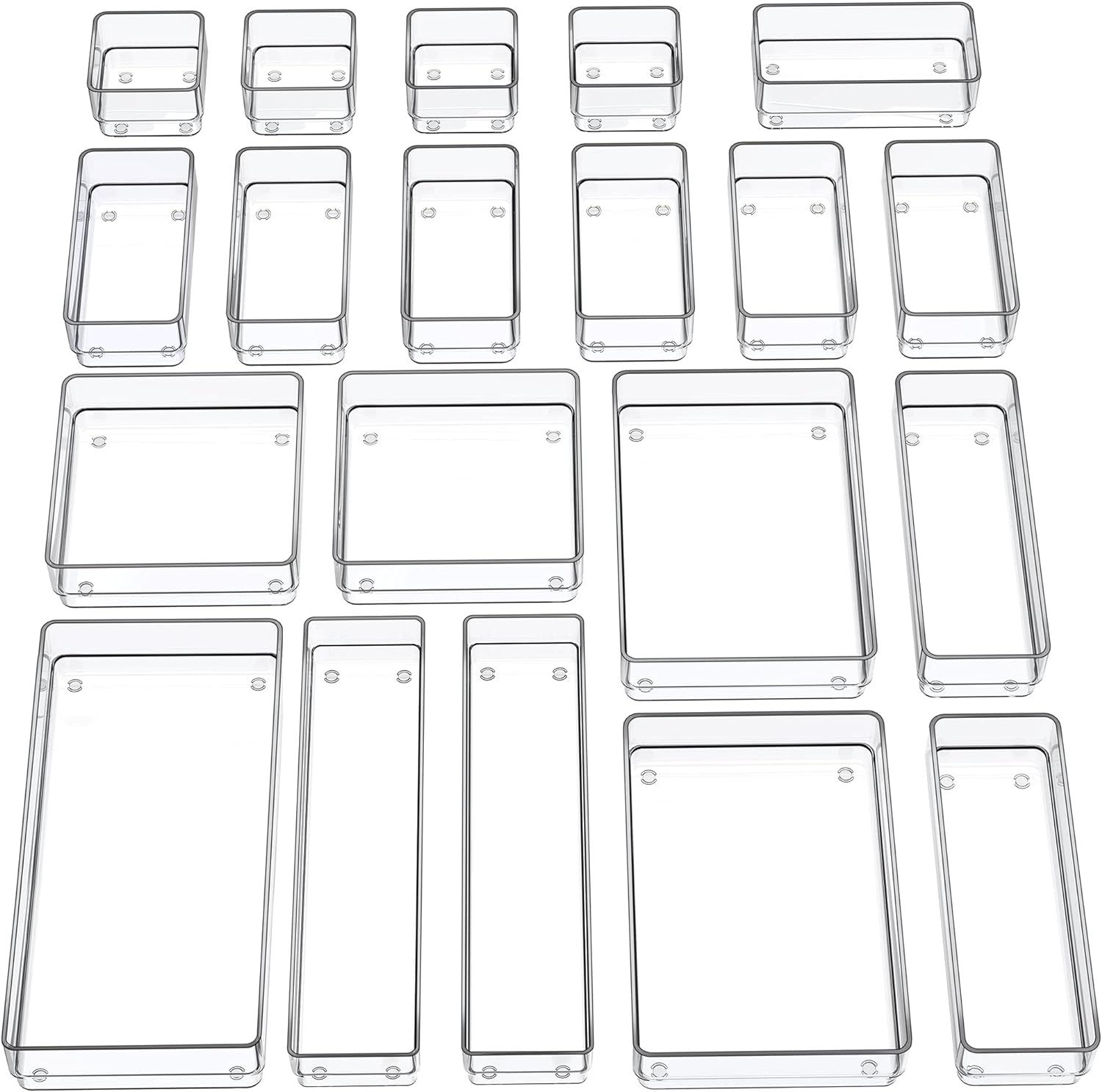 SMARTAKE 20-Piece Drawer Organizer with Non-Slip Silicone Pads, 7-Size Desk Drawer Organizer Trays Storage Tray for Makeup, Jewelries, Utensils in Bedroom Dresser, Office and Kitchen (Clear)