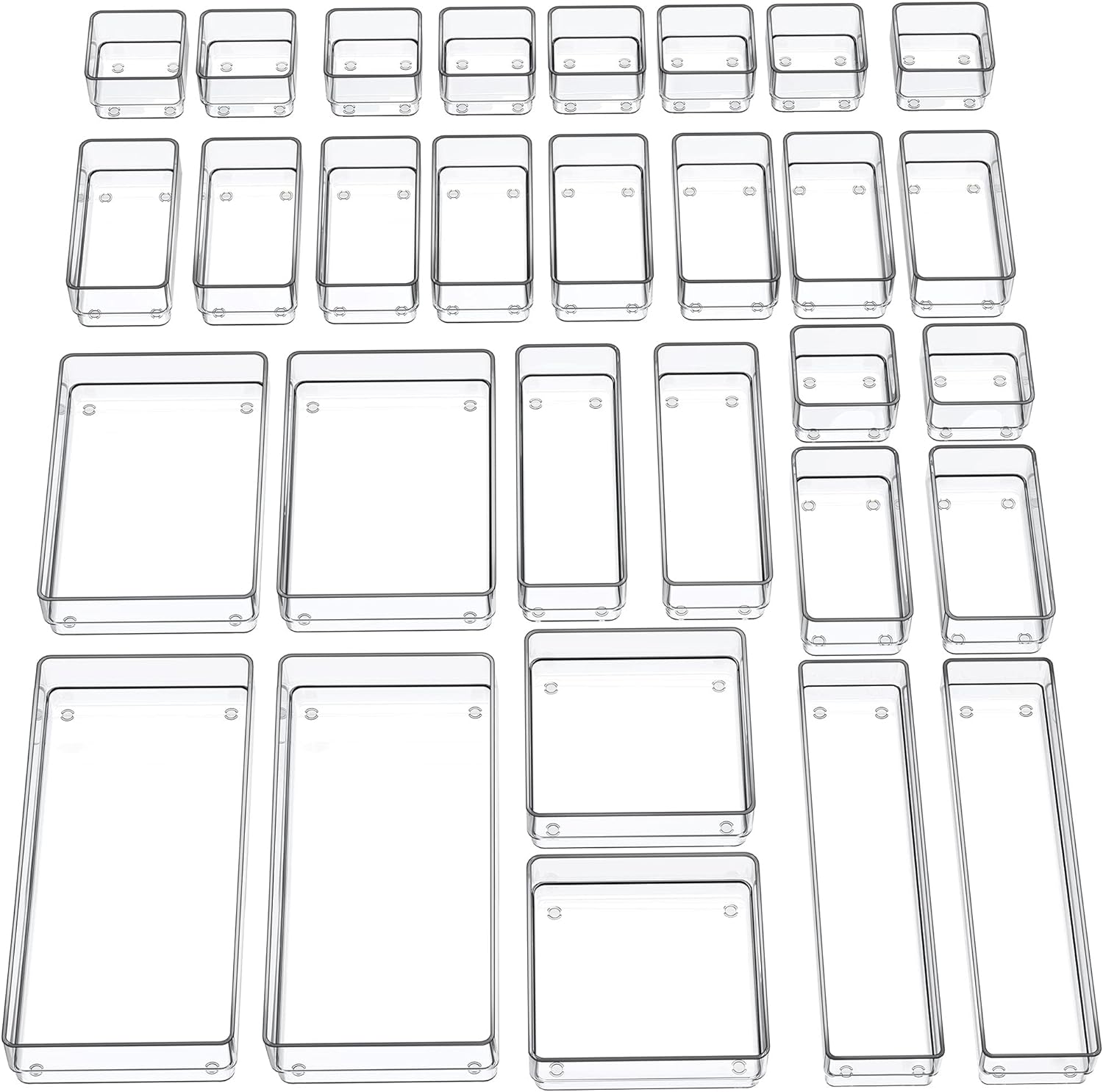 SMARTAKE 30-Piece Drawer Organizer with Non-Slip Silicone Pads, 7-Size Desk Drawer Organizer Trays Storage Tray for Makeup, Jewelries, Utensils in Bedroom Dresser, Office and Kitchen (Clear)