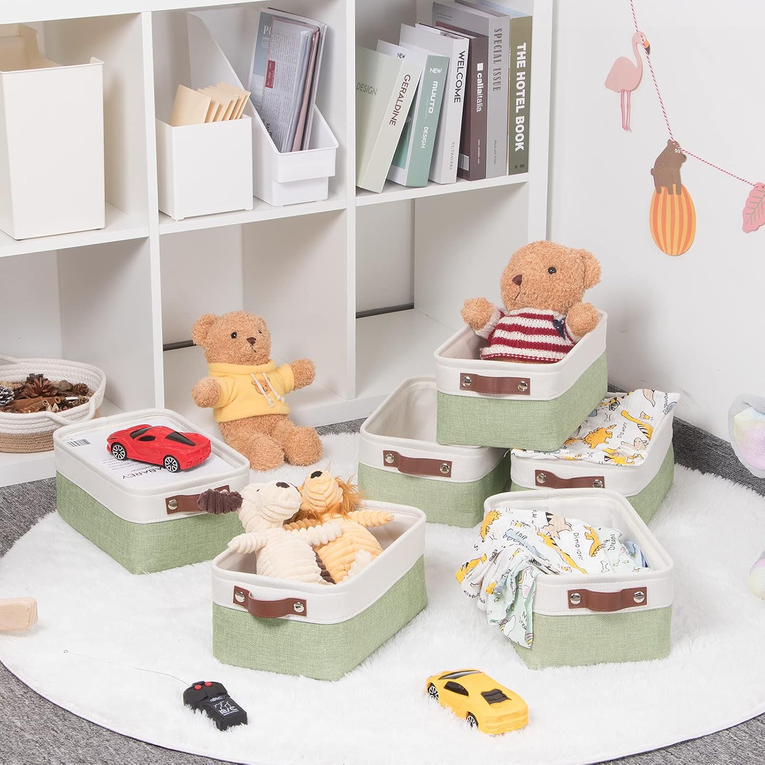 HNZIGE Collapsible Storage Baskets for Shelves(6pack) Small Fabric Bins with Handles, Linen Baskets Organizer Bins for Organizing Closet Nursery Home Shelves(White&Green, 11.8" x 7.8" x 5.1")