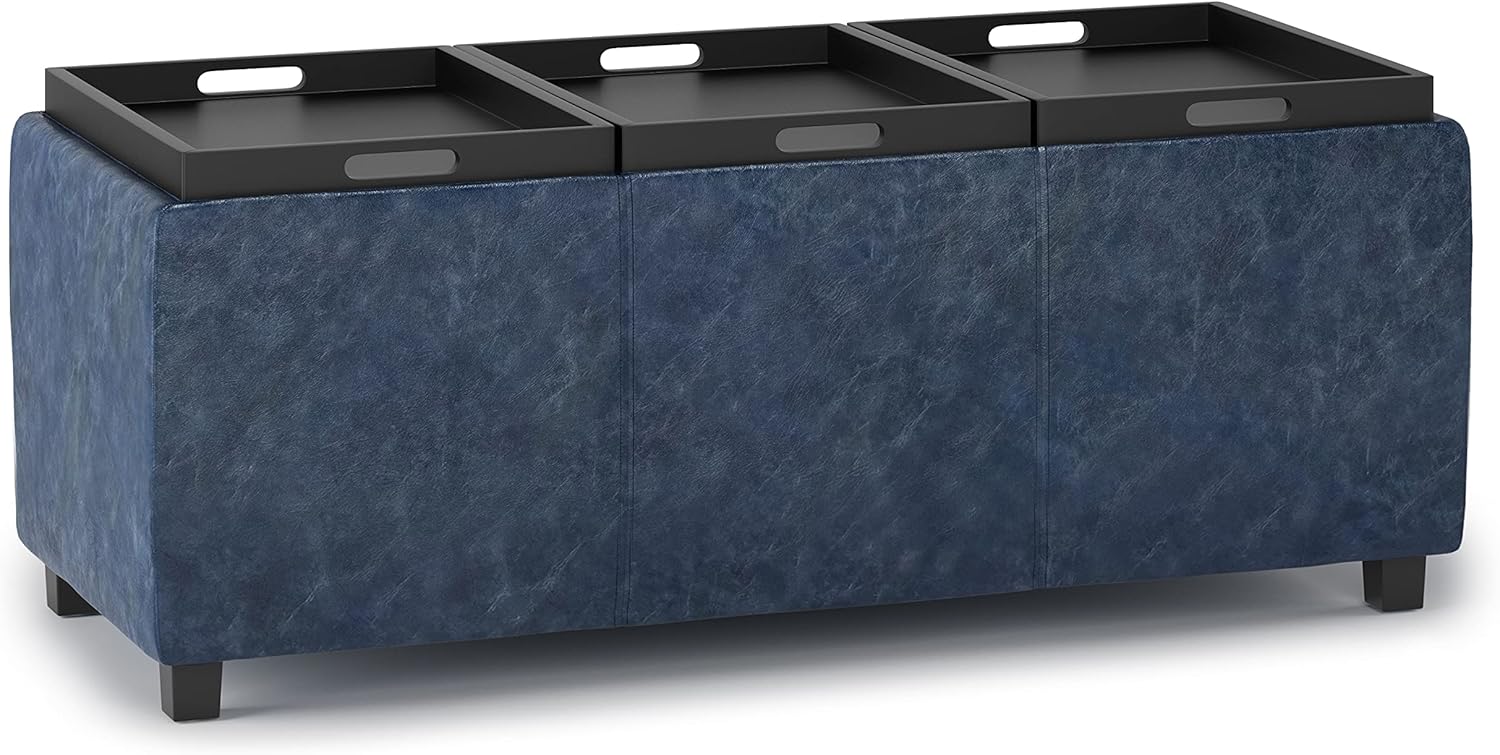 SIMPLIHOME Avalon 42 inch Wide Contemporary Rectangle Storage Ottoman in Denim Blue Vegan Faux Leather, Assembled, for the Living Room, Entryway and Family Room