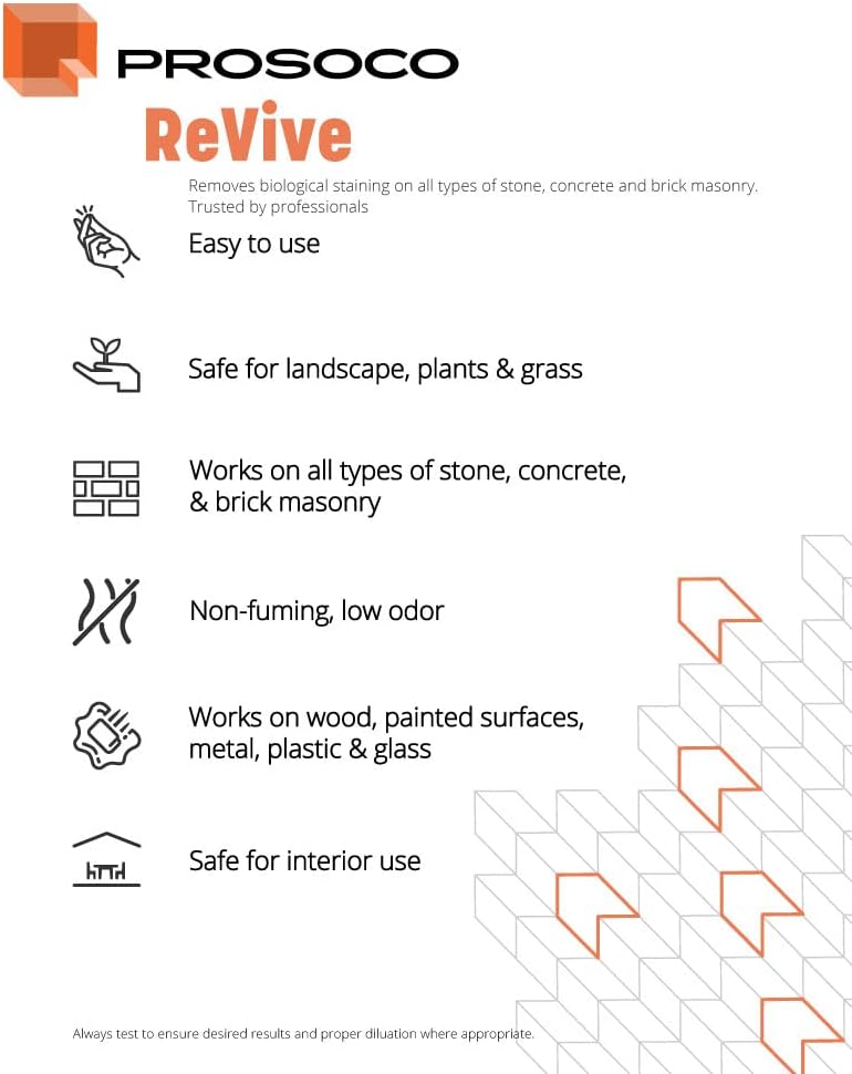 • ReVive is effective on all types of stone, concrete and brick masonry and is biodegradable and safe for landscape plantings and grass.