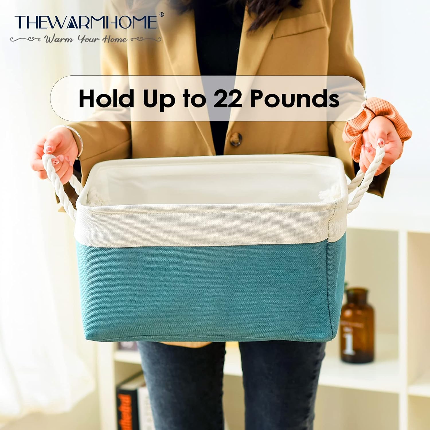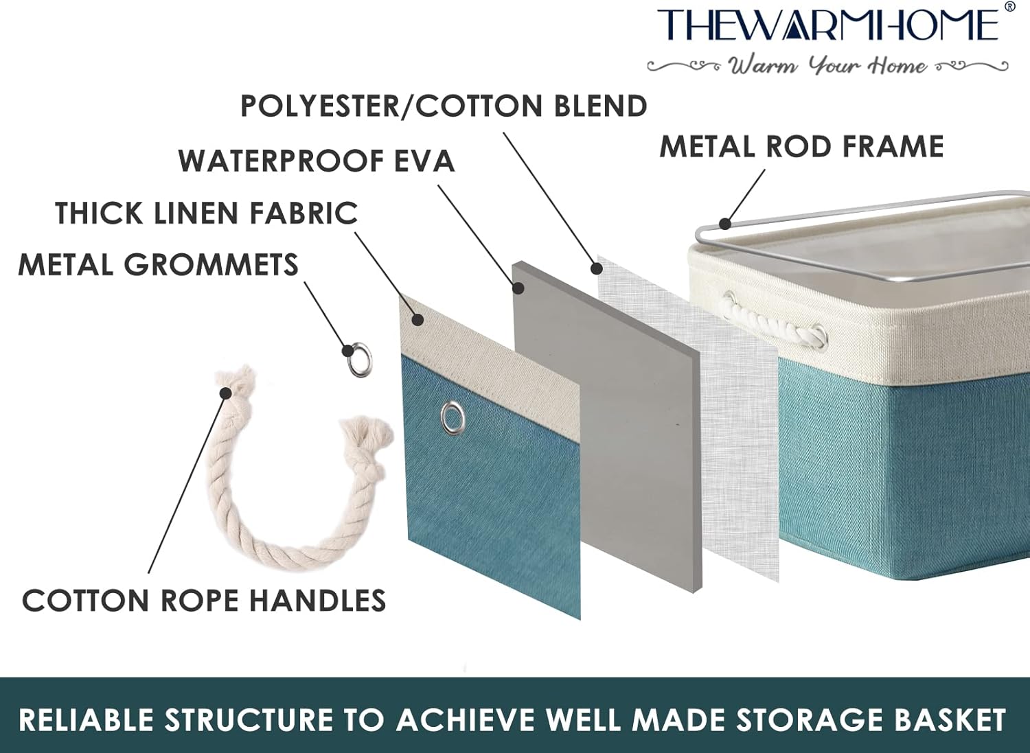 • HANDMADE STICHED & STURDY - TheWarmHome fabric storage bins outside fabric is made of more linen & thicken Environmental EVA, and used a lining material for the inside, Semi handmade stitched. Sturdy metal rod frame around the top keep the basket shape. Strong seams and rope side handles, make this storage baskets are sturdy and easy to grab. Stand up great on their own even unfilled and ensure a greater product lifespan.