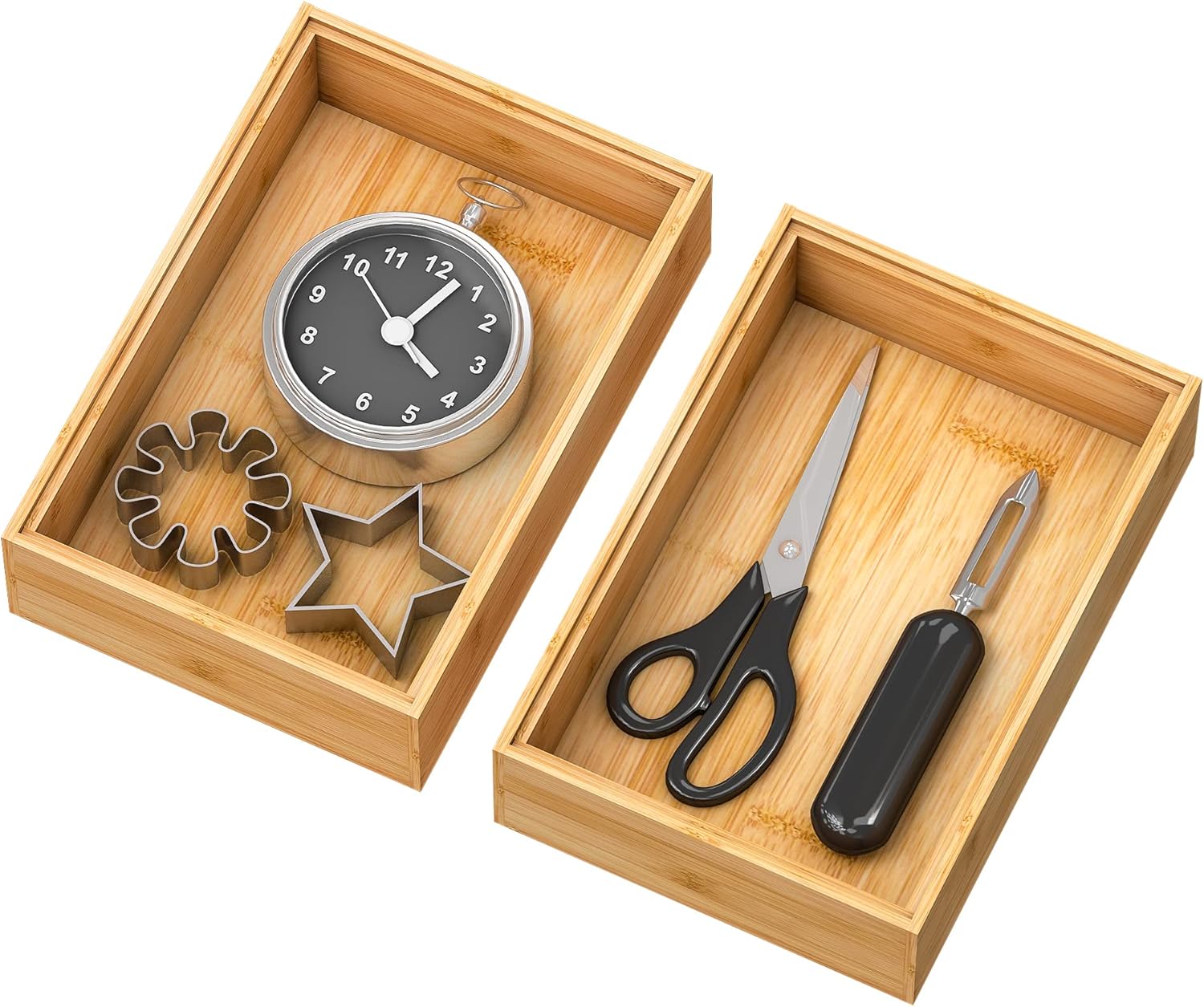• 【Sturdy Wood Drawer Organizer Storage Box】 Bambloom bamboo utensil drawer organizers are made of 100% bamboo,solid,durable, light and beautiful. It has no odor and smooth texture; compare with plastic,bamboo drawer storage boxes is a renewbale. Easy to Maintain,just wipe these small drawer organizers with a damp cloth and a mild cleaner.