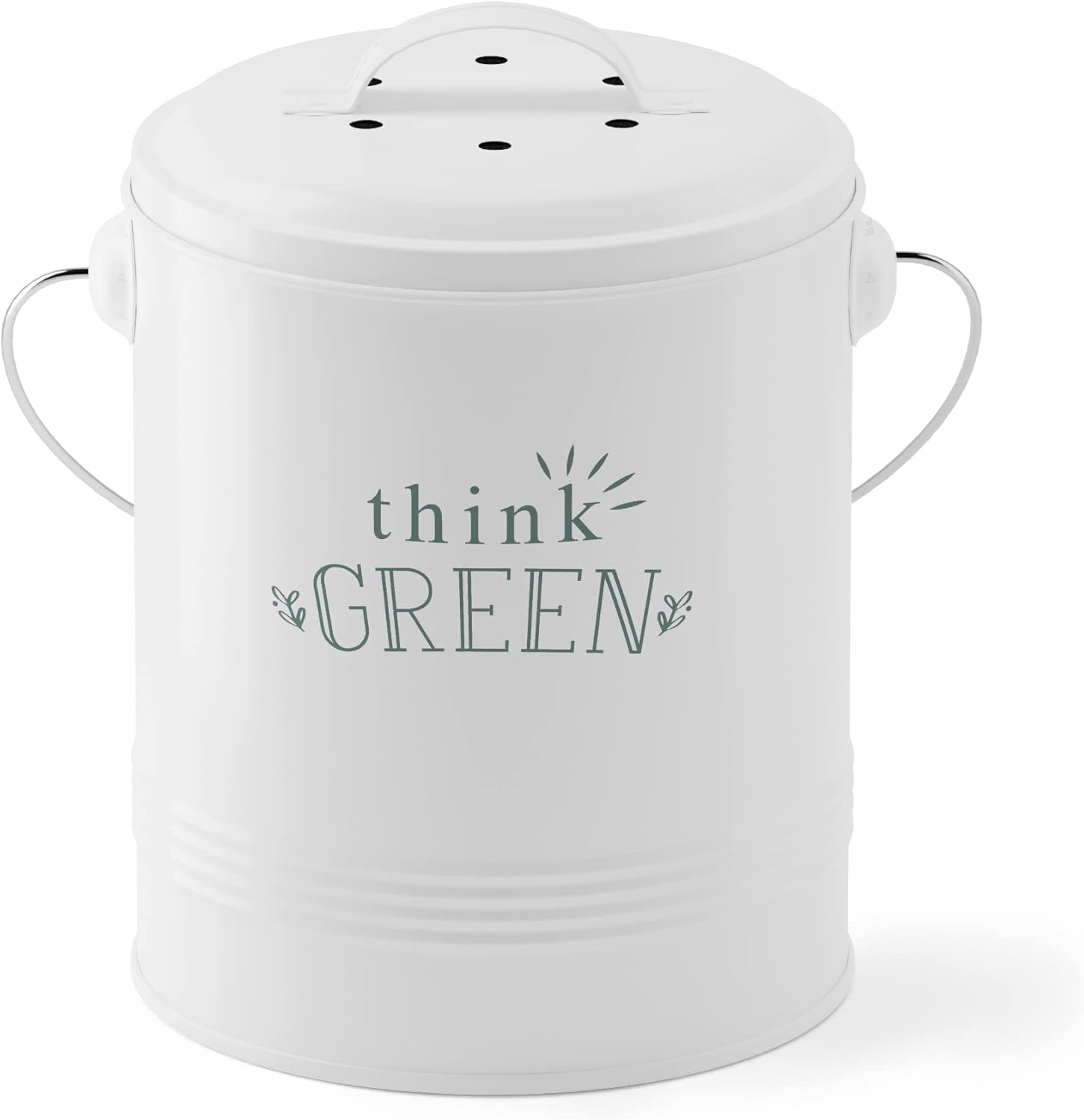 • Dimensions - Our small compost bins for kitchen measure 7"D x 9.5"H w/ lid. Height w/out lid: 7.75"H. Intended for indoor use. Material: Galvanized steel. Rust proof. Recommended compost bag size: 5 liters/1.2 gallons. Color: White.