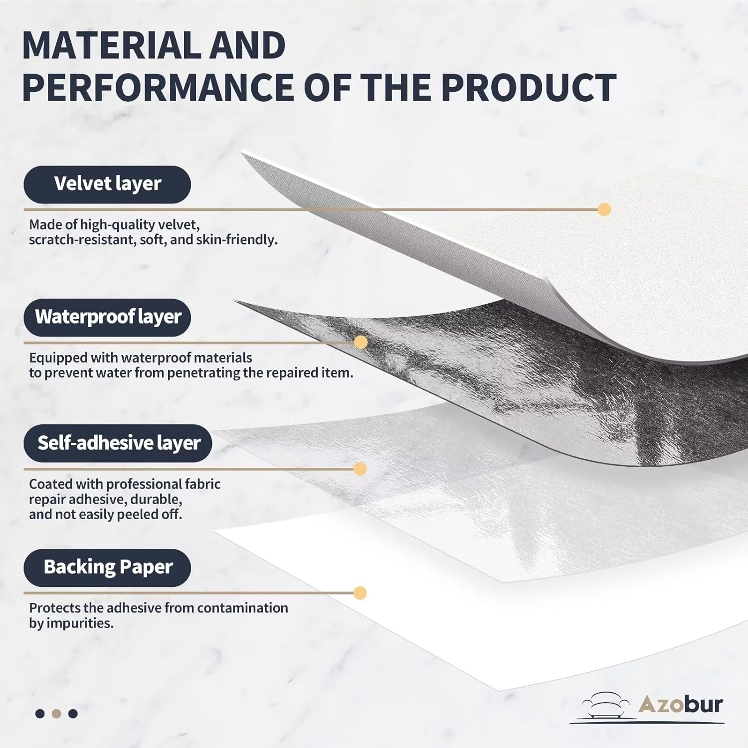 • Material and Performance: The upholstery repair tape features high-quality velvet on the front, which is scratch-resistant, soft, and skin-friendly. It has a waterproof layer in the middle to prevent water from penetrating into the repaired items. The back is coated with professional fabric repair adhesive, typically durable for at least two years. The adhesive comes with a backing paper to protect it from debris. This upholstery tape is odorless and 100% environmentally friendly.
