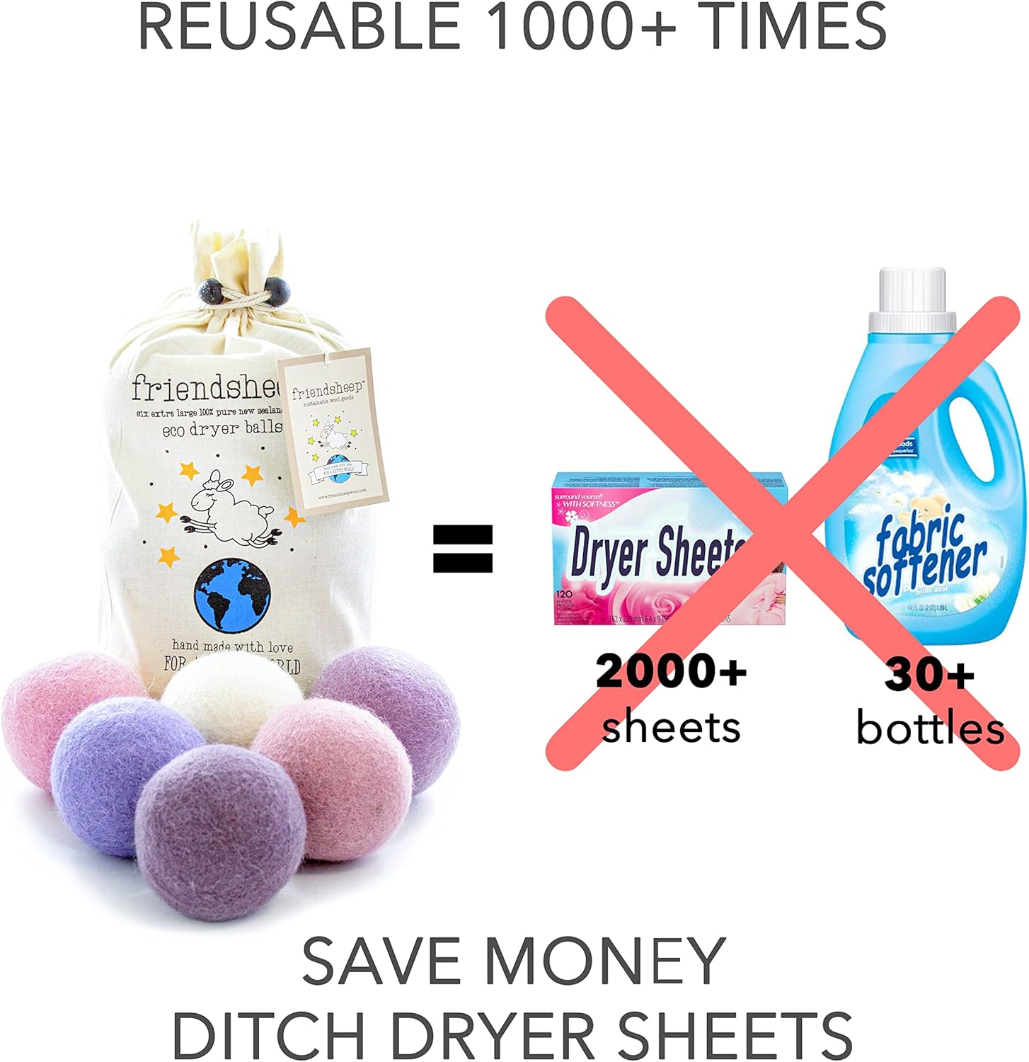 Friendsheep Wool Dryer Balls Organic Lavender 6 Pack XL Premium Reusable Cruelty Free Handmade Fair Trade No Lint Fabric Softener Color - Lavender Bliss