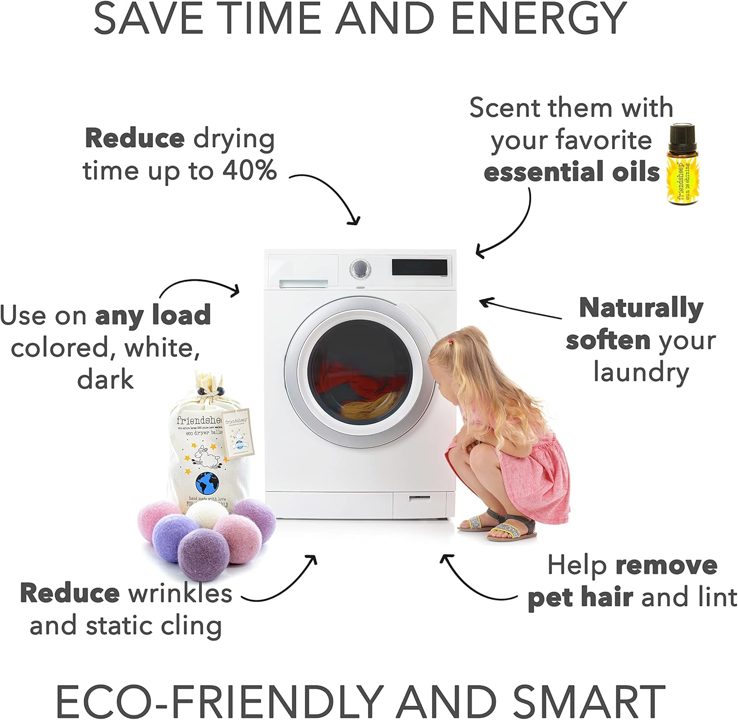 • ECO-FRIENDLY AND REUSABLE FOR 1000+ LOADS, replaces dryer sheets & liquid fabric softeners. Makes your laundry soft and fluffy, reduces wrinkles and static cling, and shortens drying time by up to 40% depending on load size. Your sheets and towels are fluffier, less balling and twisting. Makes you SAVE TIME, ENERGY, AND MONEY! All by keeping safe and healthy you, your family and the environment.